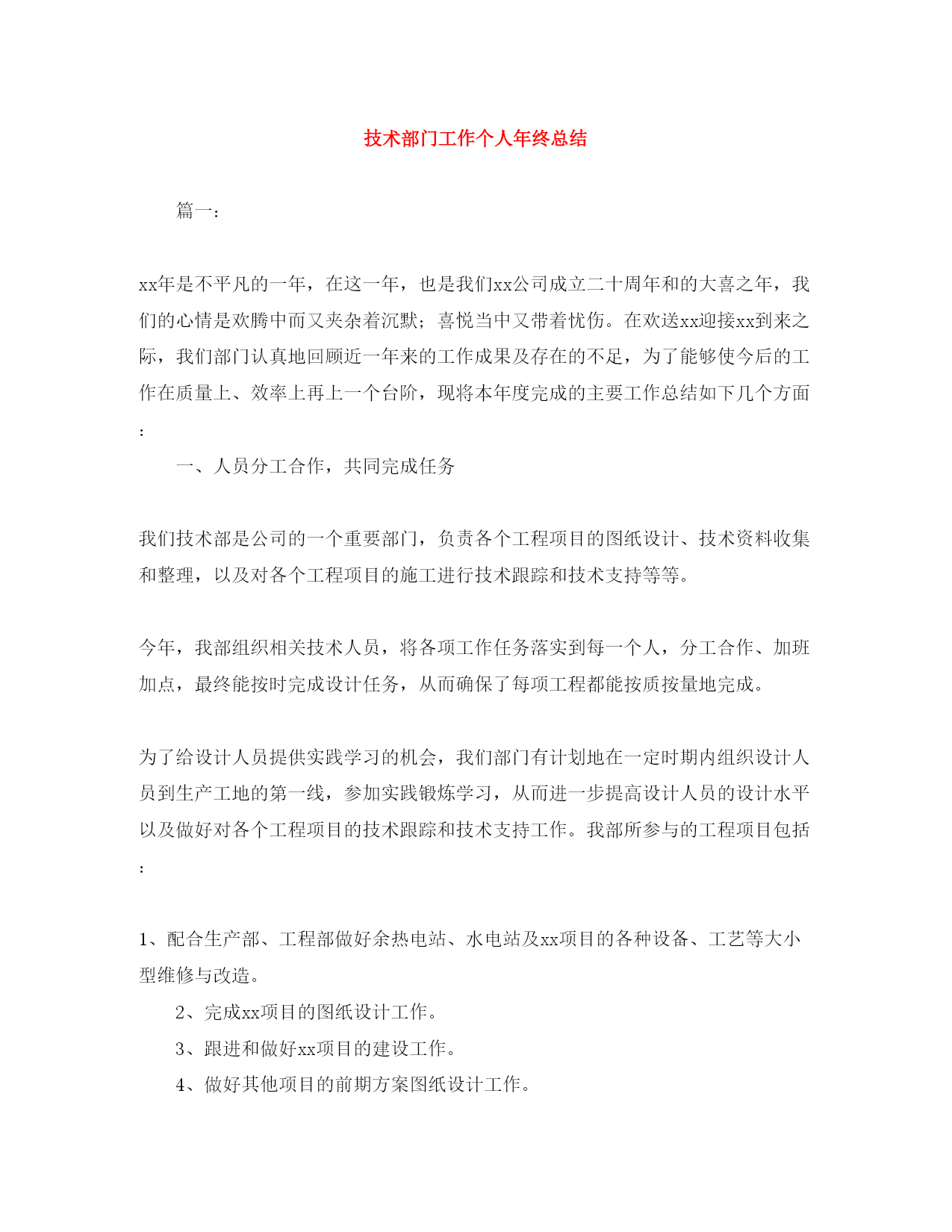 此资料由网络收集而来,如有侵权请告知上传者立即删除。资料共分享,我们负责传递知识。技术部门工作个人年终总结篇一:xx年是不平凡的一年,在这一年,也是我们xx公司成立二十周年和的大喜之年,我们的心情是欢腾中而又夹杂着沉默;喜悦当中又带着忧伤。在欢送xx迎接xx到来之际,我们部门认真地回顾近一年来的工作成果及存在的不足,为了能够使今后的工作在质量上、效率上再上一个台阶,现将本年度完成的主要工作总结如下几个方面:一、人员分工合作,共同完成任务我们技术部是公司的一个重要部门,负责各个工程项目的图纸设计、技术资料收