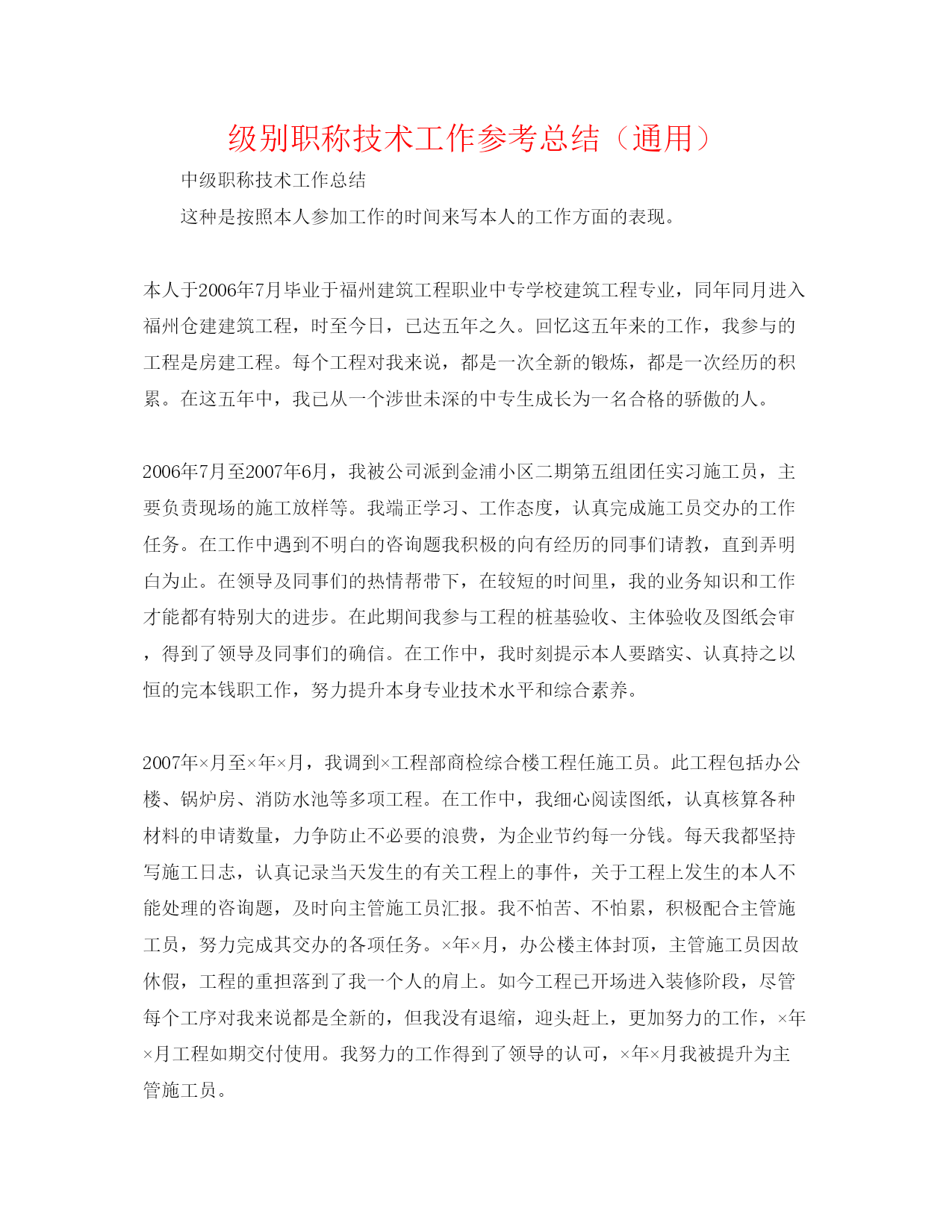级别职称技术工作参考总结(通用)中级职称技术工作总结这种是按照本人参加工作的时间来写本人的工作方面的表现。本人于2006年7月毕业于福州建筑工程职业中专学校建筑工程专业,同年同月进入福州仓建建筑工程,时至今日,已达五年之久。回忆这五年来的工作,我参与的工程是房建工程。每个工程对我来说,都是一次全新的锻炼,都是一次经历的积累。在这五年中,我已从一个涉世未深的中专生成长为一名合格的骄傲的人。2006年7月至2007年6月,我被公司派到金浦小区二期第五组团任实习施工员,主要负责现场的施工放样等。我端正学习、工作