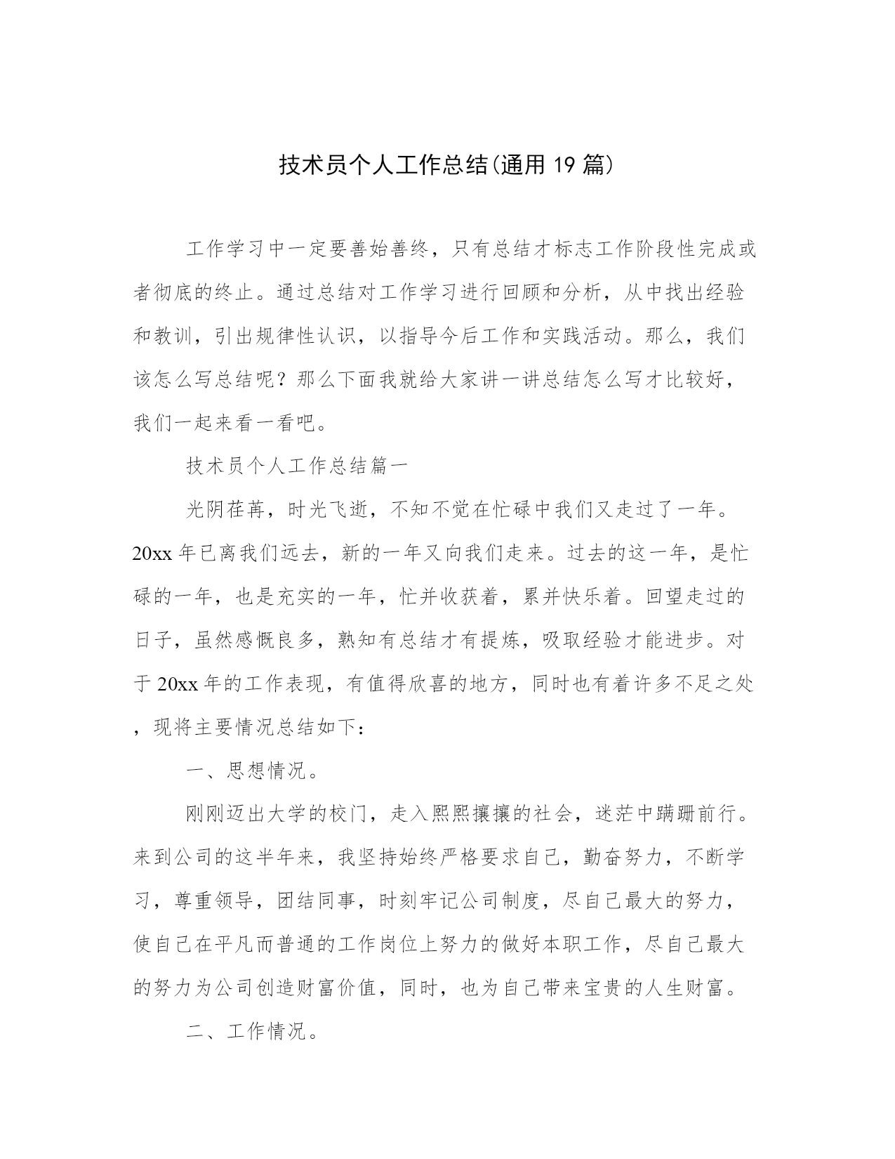 技术员个人工作总结(通用19篇)工作学习中一定要善始善终,只有总结才标志工作阶段性完成或者彻底的终止。通过总结对工作学习进行回顾和分析,从中找出经验和教训,引出规律性认识,以指导今后工作和实践活动。那么,我们该怎么写总结呢?那么下面我就给大家讲一讲总结怎么写才比较好,我们一起来看一看吧。技术员个人工作总结篇一光阴荏苒,时光飞逝,不知不觉在忙碌中我们又走过了一年。20xx年已离我们远去,新的一年又向我们走来。过去的这一年,是忙碌的一年,也是充实的一年,忙并收获着,累并快乐着。回望走过的日子,虽然感慨良多,熟
