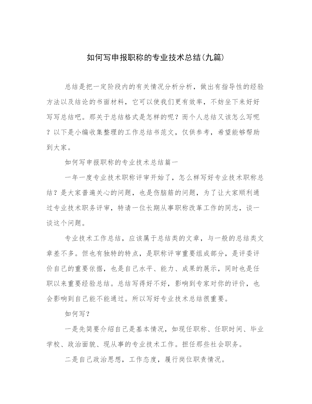 如何写申报职称的专业技术总结(九篇)总结是把一定阶段内的有关情况分析分析,做出有指导性的经验方法以及结论的书面材料,它可以使我们更有效率,不妨坐下来好好写写总结吧。那关于总结格式是怎样的呢?而个人总结又该怎么写呢?以下是小编收集整理的工作总结书范文,仅供参考,希望能够帮助到大家。如何写申报职称的专业技术总结篇一一年一度专业技术职称评审开始了,怎么样写好专业技术职称总结?是大家普遍关心的问题,也是伤脑筋的问题,为了让大家顺利通过专业技术职务评审,特请一位长期从事职称改革工作的同志,谈一谈这个问题。专业技术工