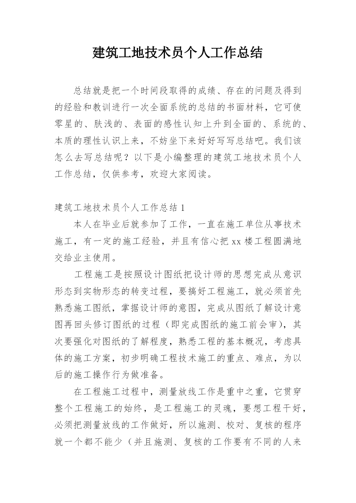 建筑工地技术员个人工作总结总结就是把一个时间段取得的成绩、存在的问题及得到的经验和教训进行一次全面系统的总结的书面材料,它可使零星的、肤浅的、表面的感性认知上升到全面的、系统的、本质的理性认识上来,不妨坐下来好好写写总结吧。我们该怎么去写总结呢?以下是小编整理的建筑工地技术员个人工作总结,仅供参考,欢迎大家阅读。建筑工地技术员个人工作总结1本人在毕业后就参加了工作,一直在施工单位从事技术施工,有一定的施工经验,并且有信心把xx楼工程圆满地交给业主使用。工程施工是按照设计图纸把设计师的思想完成从意识形态到实