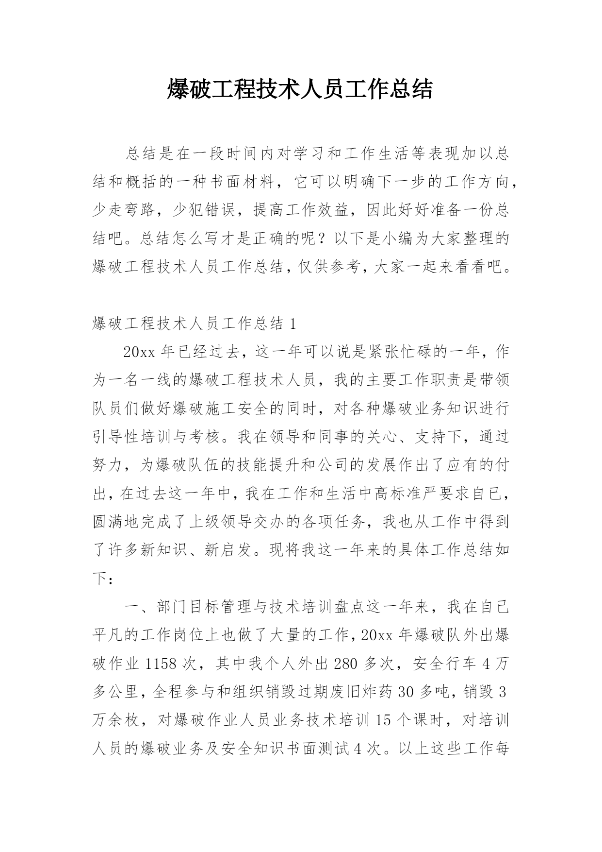爆破工程技术人员工作总结总结是在一段时间内对学习和工作生活等表现加以总结和概括的一种书面材料,它可以明确下一步的工作方向,少走弯路,少犯错误,提高工作效益,因此好好准备一份总结吧。总结怎么写才是正确的呢?以下是小编为大家整理的爆破工程技术人员工作总结,仅供参考,大家一起来看看吧。爆破工程技术人员工作总结120xx年已经过去,这一年可以说是紧张忙碌的一年,作为一名一线的爆破工程技术人员,我的主要工作职责是带领队员们做好爆破施工安全的同时,对各种爆破业务知识进行引导性培训与考核。我在领导和同事的关心、支持下,