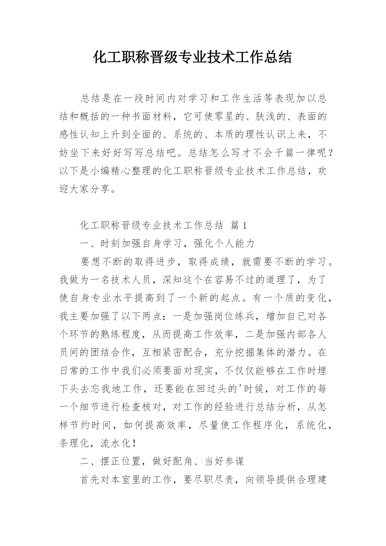 化工职称晋级专业技术工作总结总结是在一段时间内对学习和工作生活等表现加以总结和概括的一种书面材料,它可使零星的、肤浅的、表面的感性认知上升到全面的、系统的、本质的理性认识上来,不妨坐下来好好写写总结吧。总结怎么写才不会千篇一律呢?以下是小编精心整理的化工职称晋级专业技术工作总结,欢迎大家分享。化工职称晋级专业技术工作总结篇1一、时刻加强自身学习,强化个人能力要想不断的取得进步,取得成绩,就需要不断的学习。我做为一名技术人员,深知这个在容易不过的道理了,为了使自身专业水平提高到了一个新的起点。有一个质的变化