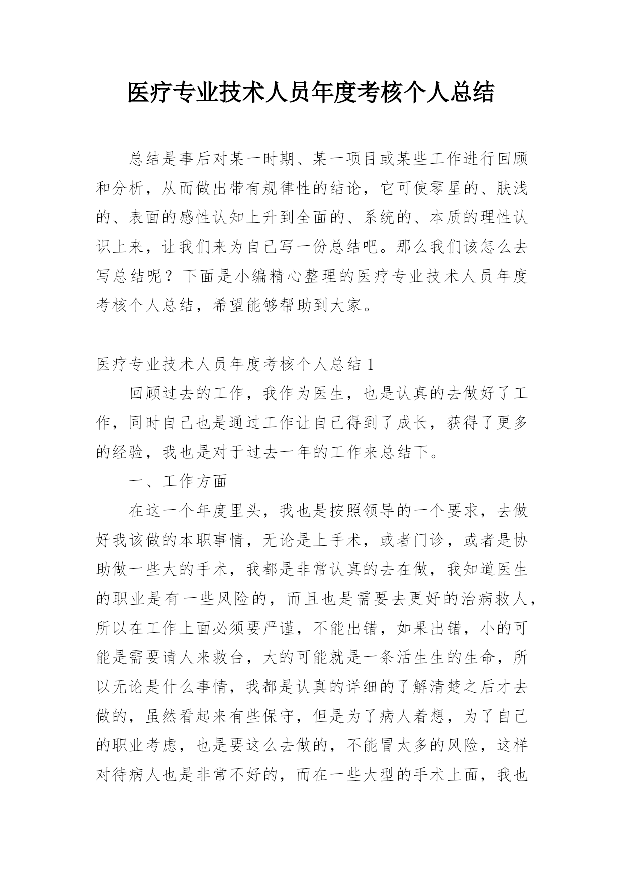 医疗专业技术人员年度考核个人总结总结是事后对某一时期、某一项目或某些工作进行回顾和分析,从而做出带有规律性的结论,它可使零星的、肤浅的、表面的感性认知上升到全面的、系统的、本质的理性认识上来,让我们来为自己写一份总结吧。那么我们该怎么去写总结呢?下面是小编精心整理的医疗专业技术人员年度考核个人总结,希望能够帮助到大家。医疗专业技术人员年度考核个人总结1回顾过去的工作,我作为医生,也是认真的去做好了工作,同时自己也是通过工作让自己得到了成长,获得了更多的经验,我也是对于过去一年的工作来总结下。一、工作方面在
