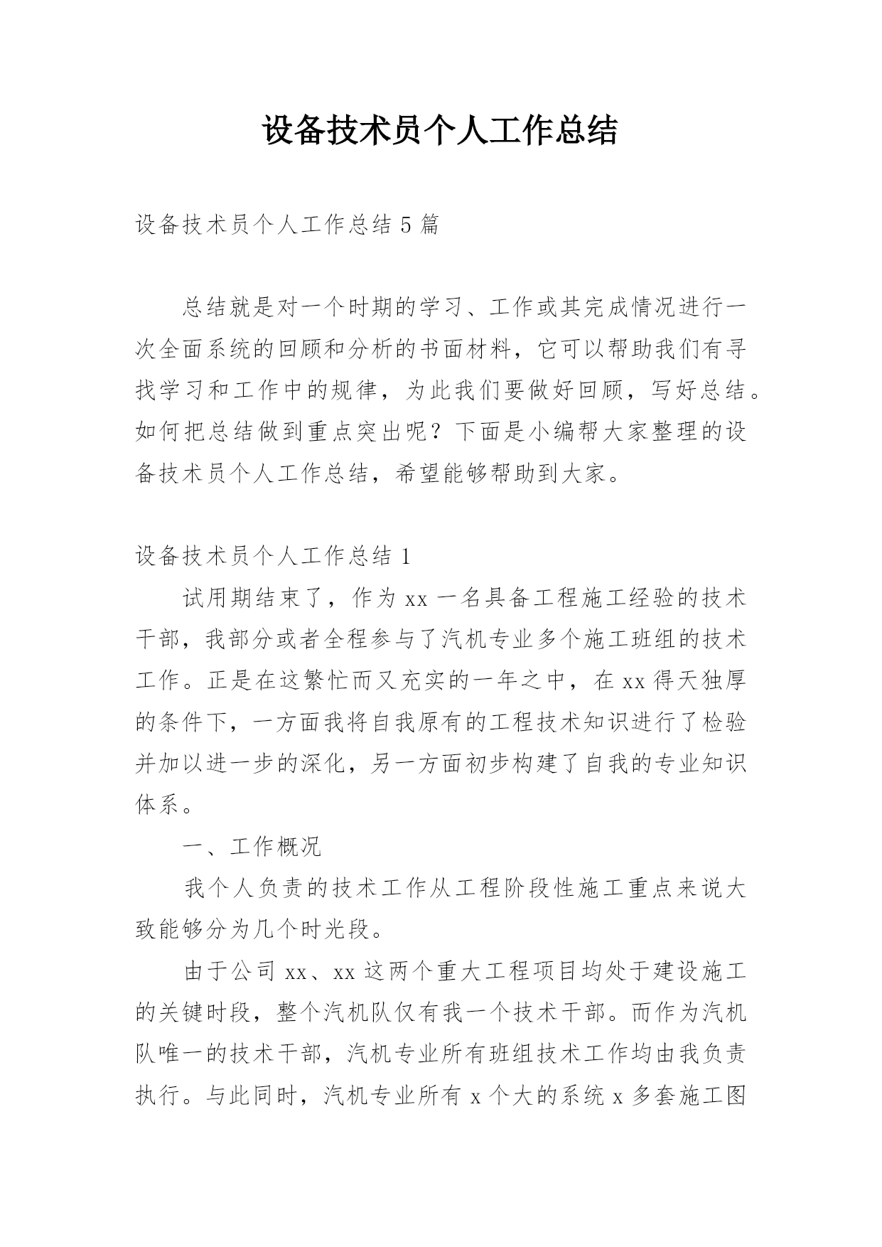 设备技术员个人工作总结设备技术员个人工作总结5篇总结就是对一个时期的学习、工作或其完成情况进行一次全面系统的回顾和分析的书面材料,它可以帮助我们有寻找学习和工作中的规律,为此我们要做好回顾,写好总结。如何把总结做到重点突出呢?下面是小编帮大家整理的设备技术员个人工作总结,希望能够帮助到大家。设备技术员个人工作总结1试用期结束了,作为xx一名具备工程施工经验的技术干部,我部分或者全程参与了汽机专业多个施工班组的技术工作。正是在这繁忙而又充实的一年之中,在xx得天独厚的条件下,一方面我将自我原有的工程技术知识