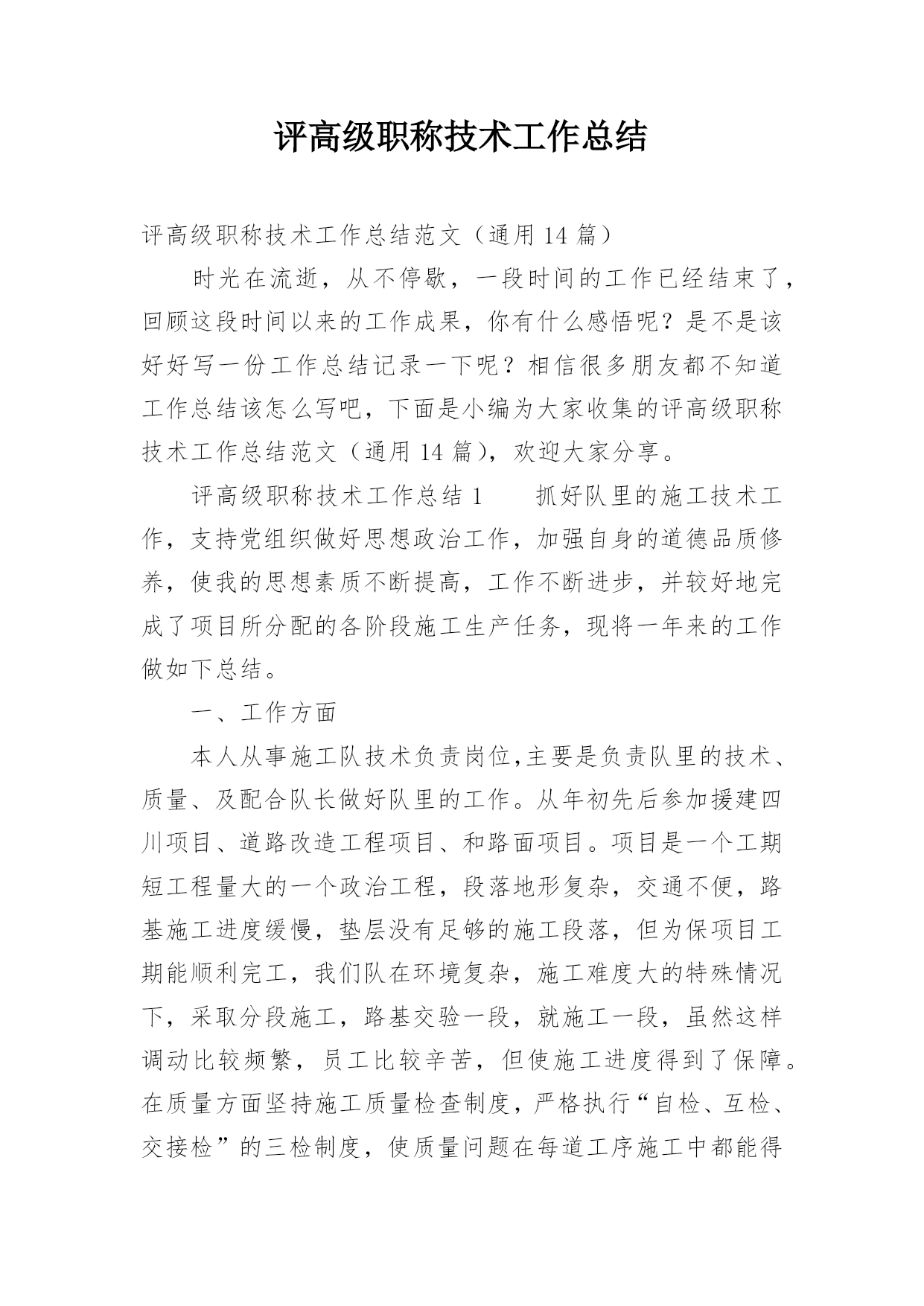 评高级职称技术工作总结评高级职称技术工作总结范文(通用14篇)时光在流逝,从不停歇,一段时间的工作已经结束了,回顾这段时间以来的工作成果,你有什么感悟呢?是不是该好好写一份工作总结记录一下呢?相信很多朋友都不知道工作总结该怎么写吧,下面是小编为大家收集的评高级职称技术工作总结范文(通用14篇),欢迎大家分享。评高级职称技术工作总结1抓好队里的施工技术工作,支持党组织做好思想政治工作,加强自身的道德品质修养,使我的思想素质不断提高,工作不断进步,并较好地完成了项目所分配的各阶段施工生产任务,现将一年来的工作