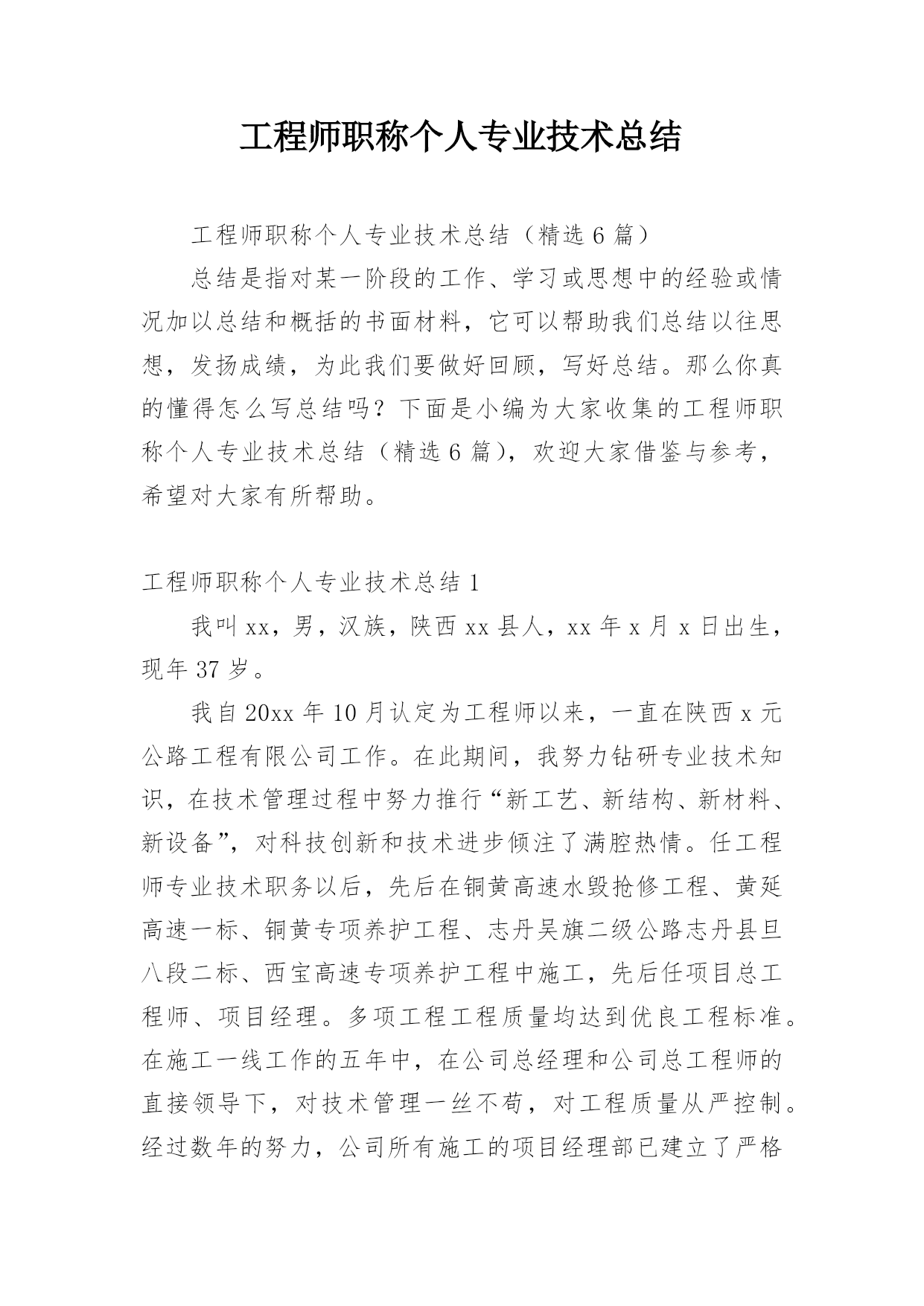工程师职称个人专业技术总结工程师职称个人专业技术总结(精选6篇)总结是指对某一阶段的工作、学习或思想中的经验或情况加以总结和概括的书面材料,它可以帮助我们总结以往思想,发扬成绩,为此我们要做好回顾,写好总结。那么你真的懂得怎么写总结吗?下面是小编为大家收集的工程师职称个人专业技术总结(精选6篇),欢迎大家借鉴与参考,希望对大家有所帮助。工程师职称个人专业技术总结1我叫xx,男,汉族,陕西xx县人,xx年x月x日出生,现年37岁。我自20xx年10月认定为工程师以来,一直在陕西x元公路工程有限公司工作。在此