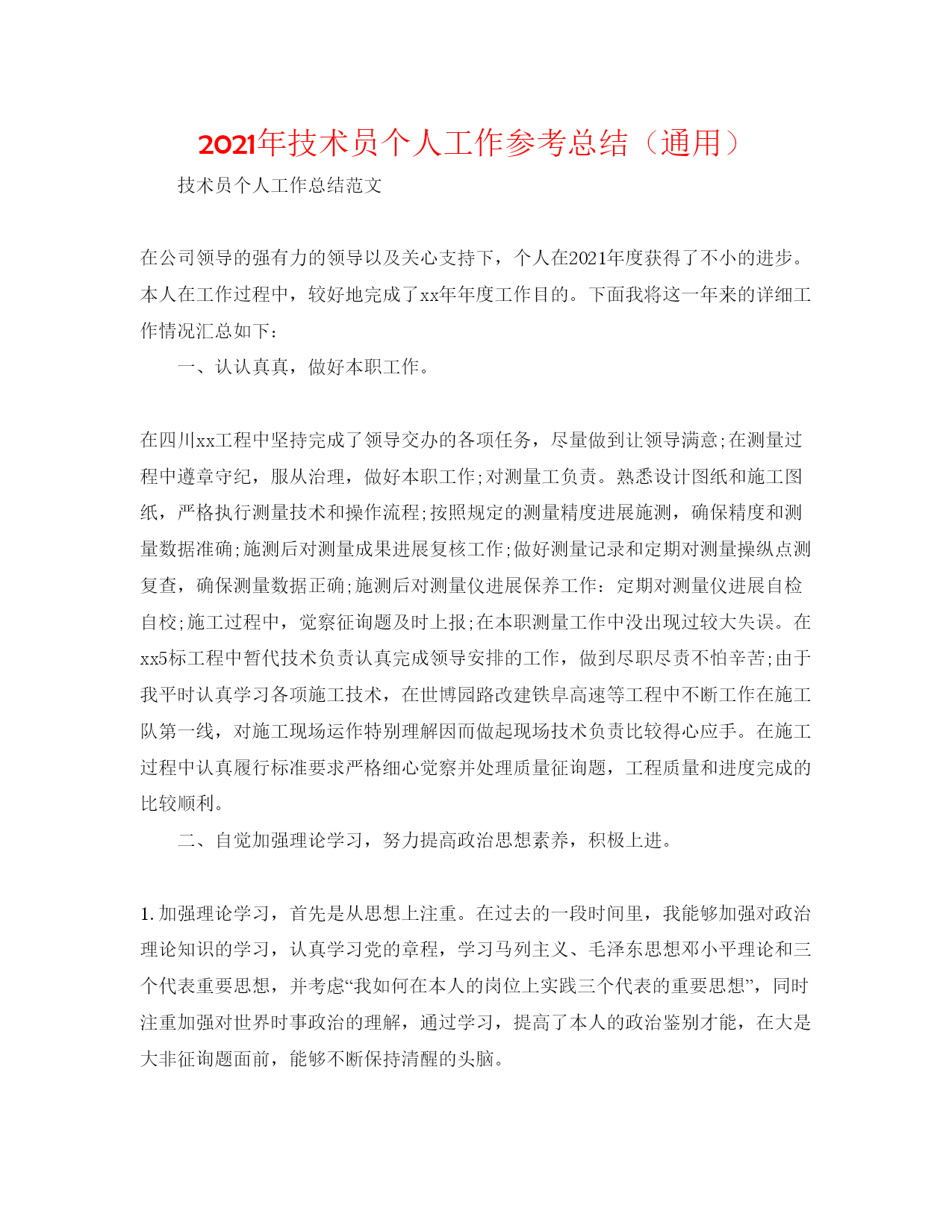 2021年技术员个人工作参考总结(通用)技术员个人工作总结范文在公司领导的强有力的领导以及关心支持下,个人在2021年度获得了不小的进步。本人在工作过程中,较好地完成了xx年年度工作目的。下面我将这一年来的详细工作情况汇总如下:一、认认真真,做好本职工作。在四川xx工程中坚持完成了领导交办的各项任务,尽量做到让领导满意;在测量过程中遵章守纪,服从治理,做好本职工作;对测量工负责。熟悉设计图纸和施工图纸,严格执行测量技术和操作流程;按照规定的测量精度进展施测,确保精度和测量数据准确;施测后对测量成果进展复核