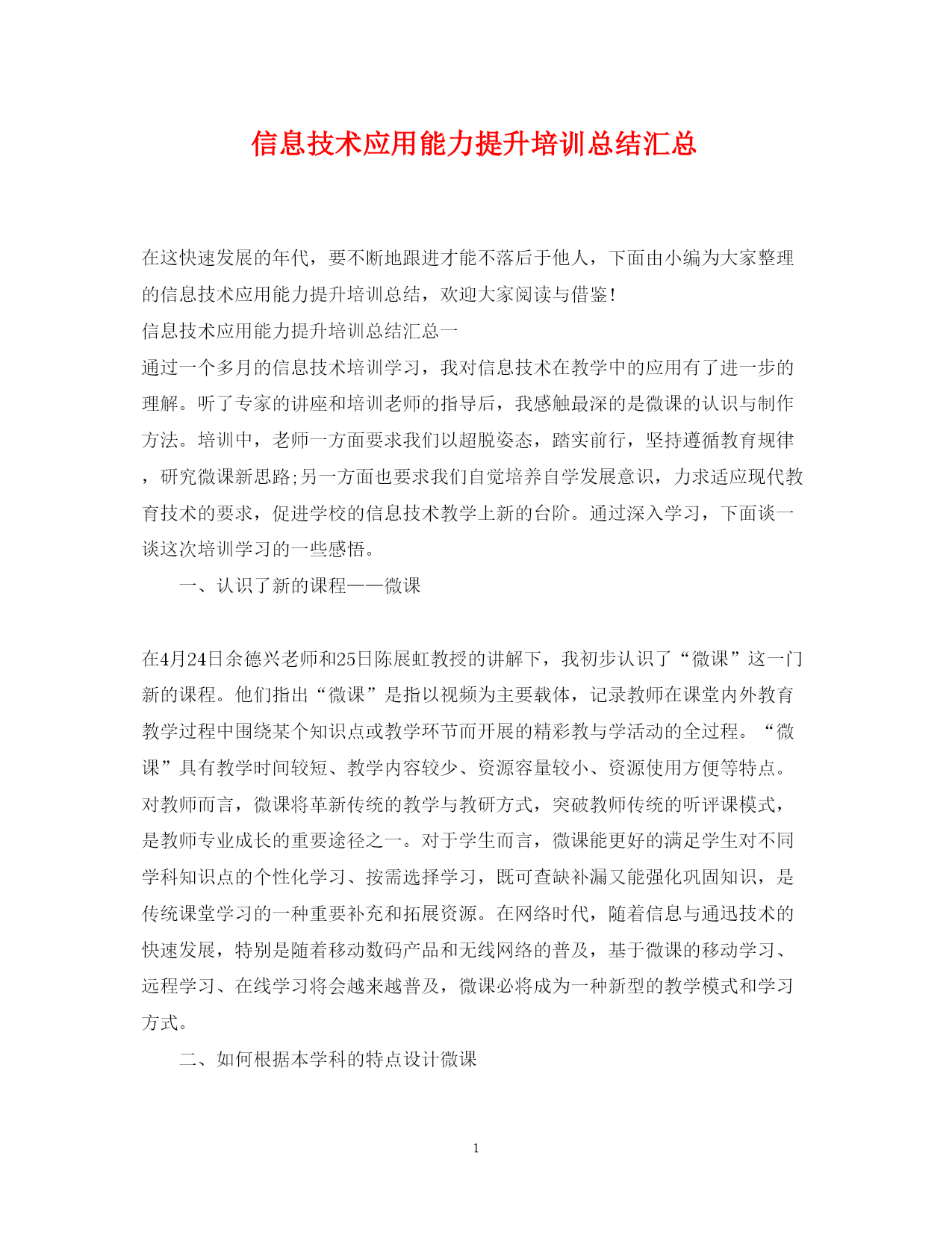 此资料由网络收集而来,如有侵权请告知上传者立即删除。资料共分享,我们负责传递知识。PAGEPAGE7信息技术应用能力提升培训总结汇总在这快速发展的年代,要不断地跟进才能不落后于他人,下面由小编为大家整理的信息技术应用能力提升培训总结,欢迎大家阅读与借鉴!信息技术应用能力提升培训总结汇总一通过一个多月的信息技术培训学习,我对信息技术在教学中的应用有了进一步的理解。听了专家的讲座和培训老师的指导后,我感触最深的是微课的认识与制作方法。培训中,老师一方面要求我们以超脱姿态,踏实前行,坚持遵循教育规律