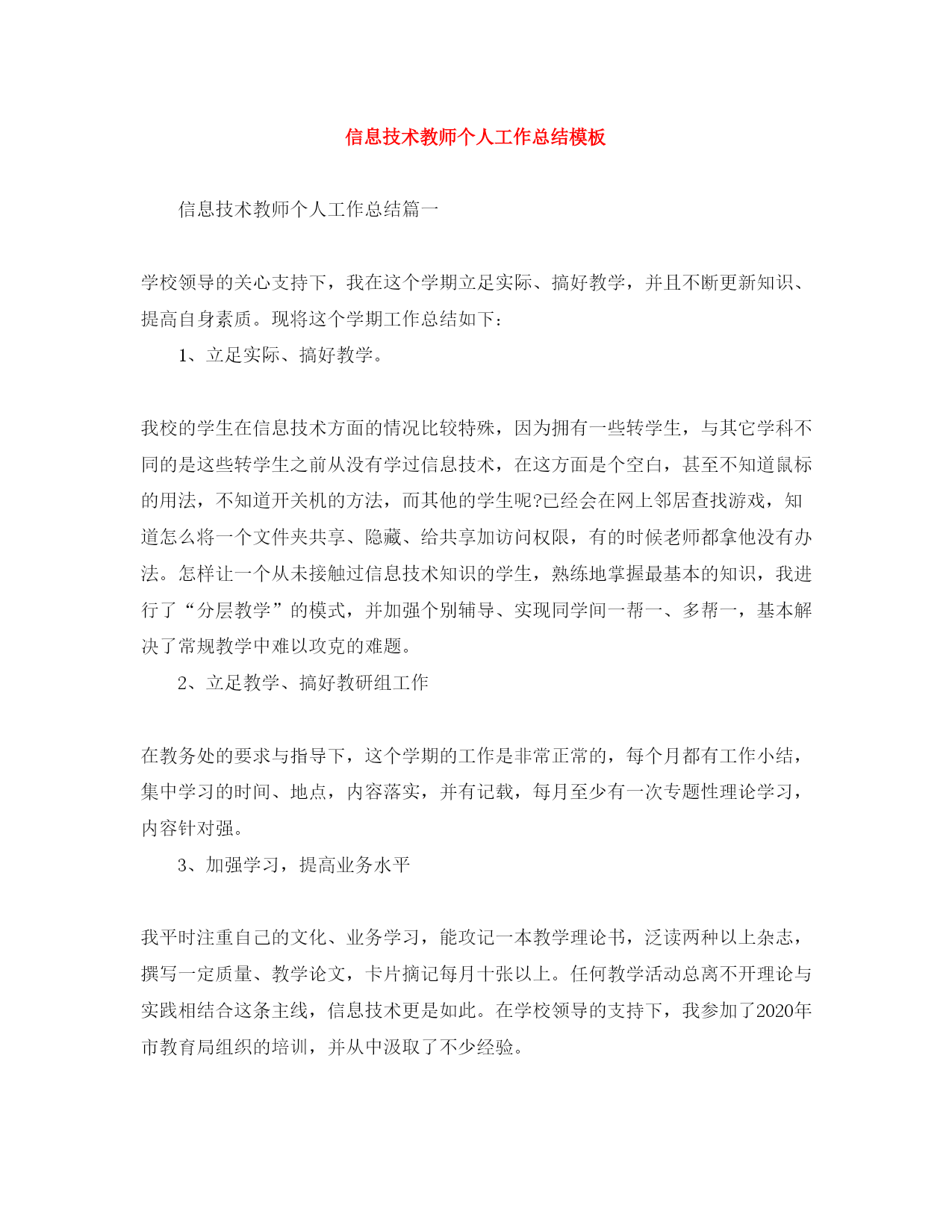 此资料由网络收集而来,如有侵权请告知上传者立即删除。资料共分享,我们负责传递知识。信息技术教师个人工作总结模板信息技术教师个人工作总结篇一学校领导的关心支持下,我在这个学期立足实际、搞好教学,并且不断更新知识、提高自身素质。现将这个学期工作总结如下:1、立足实际、搞好教学。我校的学生在信息技术方面的情况比较特殊,因为拥有一些转学生,与其它学科不同的是这些转学生之前从没有学过信息技术,在这方面是个空白,甚至不知道鼠标的用法,不知道开关机的方法,而其他的学生呢?已经会在网上邻居查找游戏,知道怎么将一个文件夹共