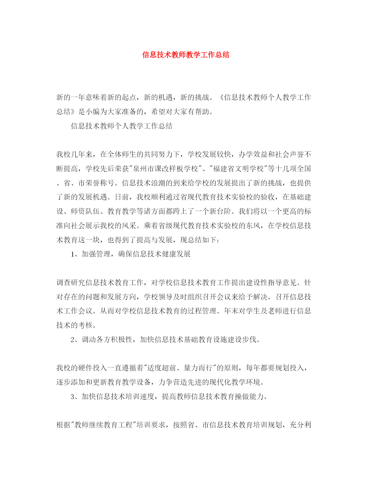 此资料由网络收集而来,如有侵权请告知上传者立即删除。资料共分享,我们负责传递知识。信息技术教师教学工作总结新的一年意味着新的起点,新的机遇,新的挑战。《信息技术教师个人教学工作总结》是小编为大家准备的,希望对大家有帮助。信息技术教师个人教学工作总结我校几年来,在全体师生的共同努力下,学校发展较快,办学效益和社会声誉不断提高,学校先后荣获"泉州市课改样板学校"、"福建省文明学校"等十几项全国、省、市荣誉称号。信息技术浪潮的到来给学校的发展提出了新的挑战,也提供了新的发展机遇。日前,我校顺利通过省现代教育技术