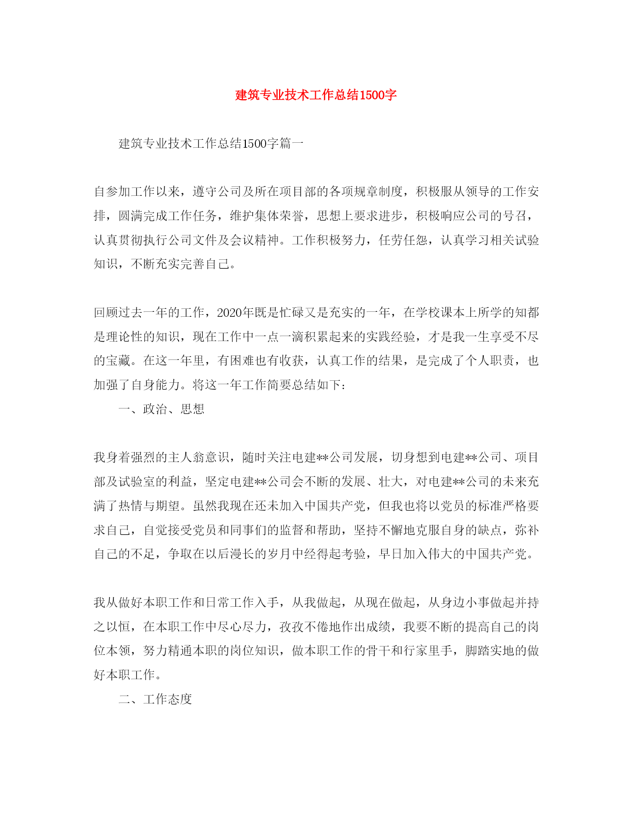 此资料由网络收集而来,如有侵权请告知上传者立即删除。资料共分享,我们负责传递知识。建筑专业技术工作总结1500字建筑专业技术工作总结1500字篇一自参加工作以来,遵守公司及所在项目部的各项规章制度,积极服从领导的工作安排,圆满完成工作任务,维护集体荣誉,思想上要求进步,积极响应公司的号召,认真贯彻执行公司文件及会议精神。工作积极努力,任劳任怨,认真学习相关试验知识,不断充实完善自己。回顾过去一年的工作,2020年既是忙碌又是充实的一年,在学校课本上所学的知都是理论性的知识,现在工作中一点一滴积累起来的实践
