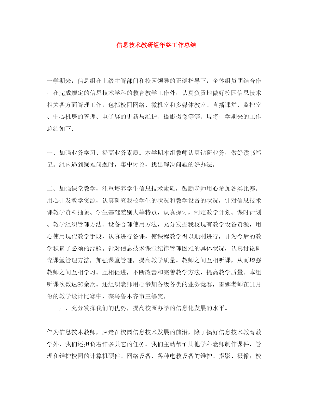 此资料由网络收集而来,如有侵权请告知上传者立即删除。资料共分享,我们负责传递知识。信息技术教研组年终工作总结一学期来,信息组在上级主管部门和校园领导的正确指导下,全体组员团结合作,在完成规定的信息技术学科的教育教学工作外,认真负责地做好校园信息技术相关各方面管理工作,包括校园网络、微机室和多媒体教室、直播课堂、监控室、中心机房的管理、电子屏的更新与维护、摄影摄像等等。现将一学期来的工作总结如下:一、加强业务学习、提高业务素质。本学期本组教师认真钻研业务,做好读书笔记。组内遇到疑难问题时,集中讨论,找出解决