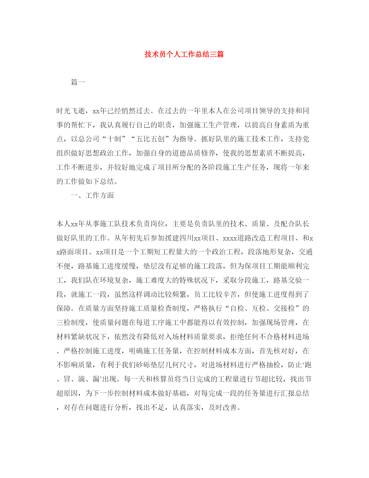此资料由网络收集而来,如有侵权请告知上传者立即删除。资料共分享,我们负责传递知识。技术员个人工作总结三篇篇一时光飞逝,xx年已经悄然过去。在过去的一年里本人在公司项目领导的支持和同事的帮忙下,我认真履行自己的职责,加强施工生产管理,以提高自身素质为重点,以总公司“十制”“五比五创”为指导。抓好队里的施工技术工作,支持党组织做好思想政治工作,加强自身的道德品质修养,使我的思想素质不断提高,工作不断进步,并较好地完成了项目所分配的各阶段施工生产任务,现将一年来的工作做如下总结。一、工作方面本人xx年从事施工队