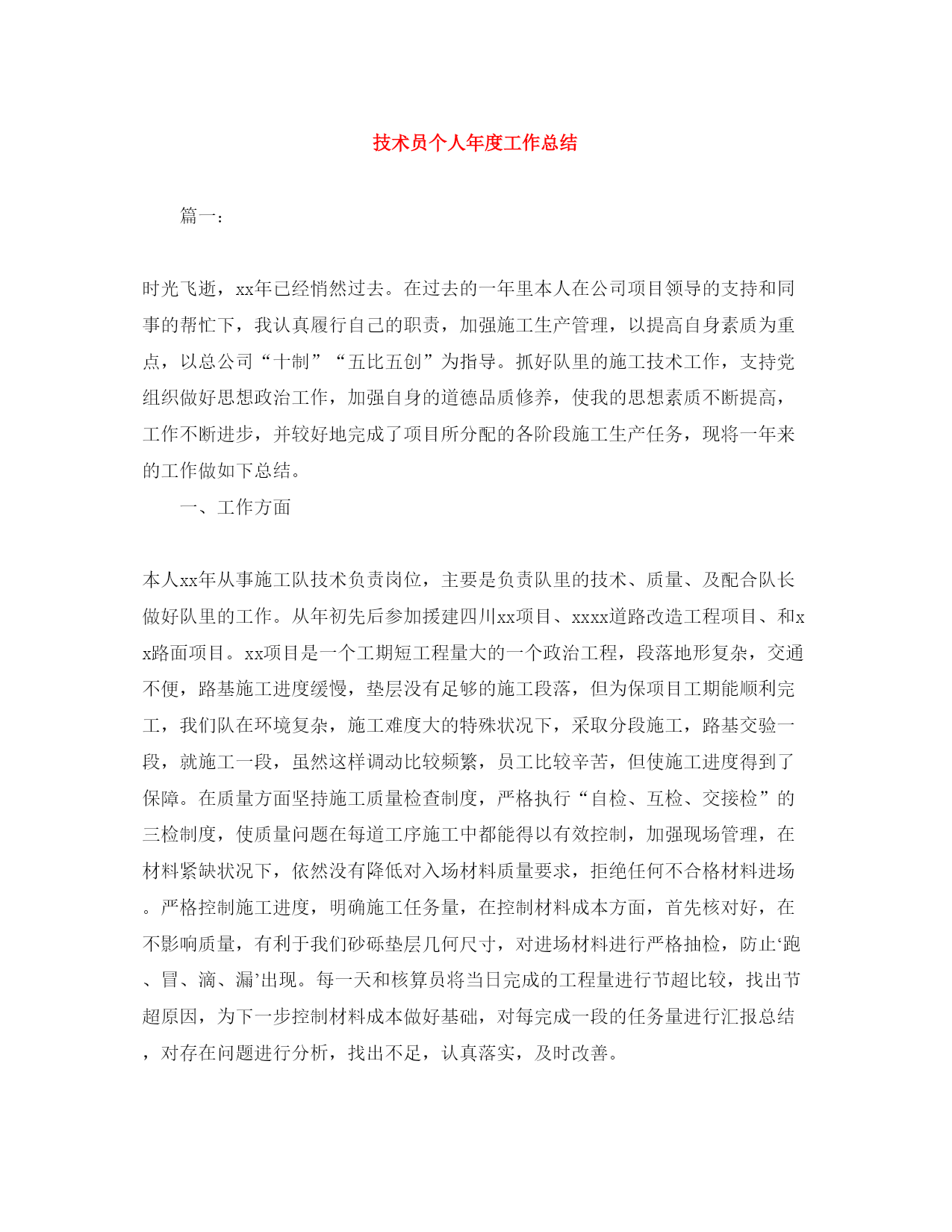 此资料由网络收集而来,如有侵权请告知上传者立即删除。资料共分享,我们负责传递知识。技术员个人年度工作总结篇一:时光飞逝,xx年已经悄然过去。在过去的一年里本人在公司项目领导的支持和同事的帮忙下,我认真履行自己的职责,加强施工生产管理,以提高自身素质为重点,以总公司“十制”“五比五创”为指导。抓好队里的施工技术工作,支持党组织做好思想政治工作,加强自身的道德品质修养,使我的思想素质不断提高,工作不断进步,并较好地完成了项目所分配的各阶段施工生产任务,现将一年来的工作做如下总结。一、工作方面本人xx年从事施工