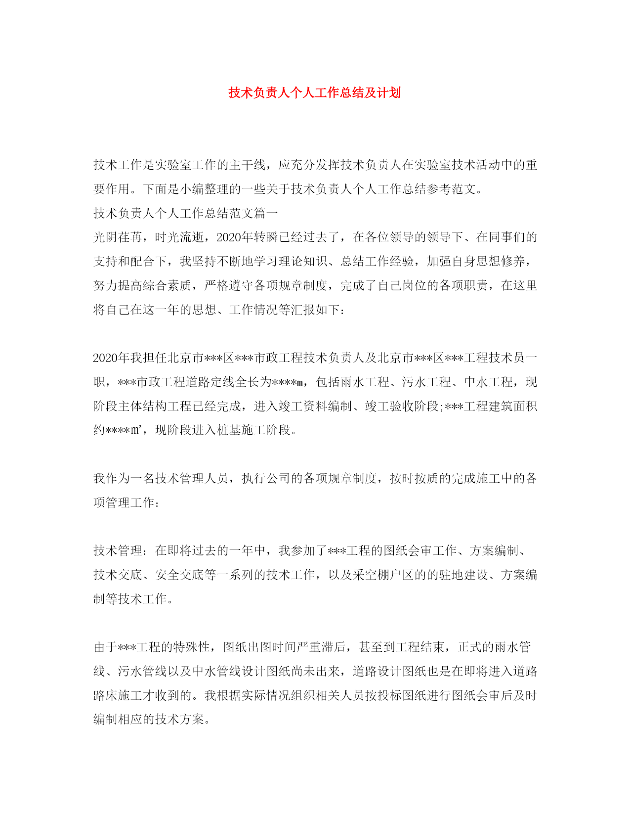 此资料由网络收集而来,如有侵权请告知上传者立即删除。资料共分享,我们负责传递知识。技术负责人个人工作总结及计划技术工作是实验室工作的主干线,应充分发挥技术负责人在实验室技术活动中的重要作用。下面是小编整理的一些关于技术负责人个人工作总结参考范文。技术负责人个人工作总结范文篇一光阴荏苒,时光流逝,2020年转瞬已经过去了,在各位领导的领导下、在同事们的支持和配合下,我坚持不断地学习理论知识、总结工作经验,加强自身思想修养,努力提高综合素质,严格遵守各项规章制度,完成了自己岗位的各项职责,在这里将自己在这一年