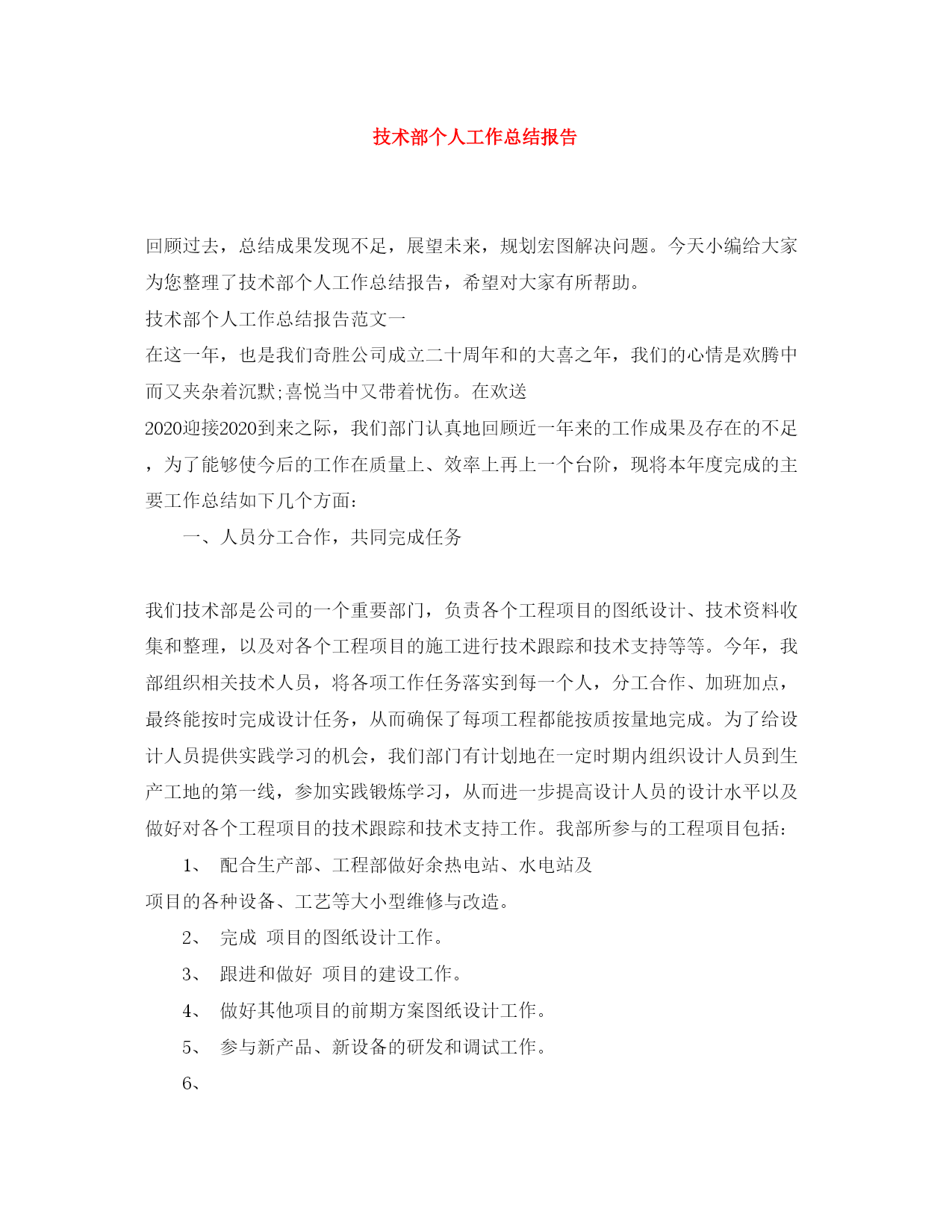 此资料由网络收集而来,如有侵权请告知上传者立即删除。资料共分享,我们负责传递知识。技术部个人工作总结报告回顾过去,总结成果发现不足,展望未来,规划宏图解决问题。今天小编给大家为您整理了技术部个人工作总结报告,希望对大家有所帮助。技术部个人工作总结报告范文一在这一年,也是我们奇胜公司成立二十周年和的大喜之年,我们的心情是欢腾中而又夹杂着沉默;喜悦当中又带着忧伤。在欢送2020迎接2020到来之际,我们部门认真地回顾近一年来的工作成果及存在的不足,为了能够使今后的工作在质量上、效率上再上一个台阶,现将本年度完