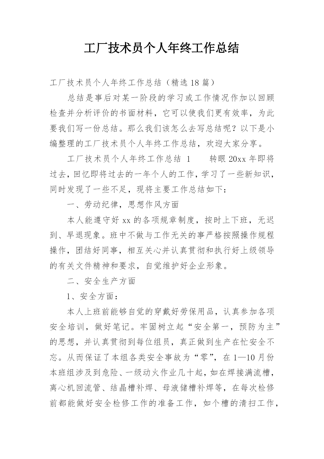 工厂技术员个人年终工作总结工厂技术员个人年终工作总结(精选18篇)总结是事后对某一阶段的学习或工作情况作加以回顾检查并分析评价的书面材料,它可以使我们更有效率,为此要我们写一份总结。那么我们该怎么去写总结呢?以下是小编整理的工厂技术员个人年终工作总结,欢迎大家分享。工厂技术员个人年终工作总结1转眼20xx年即将过去,回忆即将过去的一年个人的工作,学习了一些新知识,同时发现了一些不足,现将主要工作总结如下:一、劳动纪律,思想作风方面本人能遵守好xx的各项规章制度,按时上下班,无迟到、早退现象。班中不做与工作