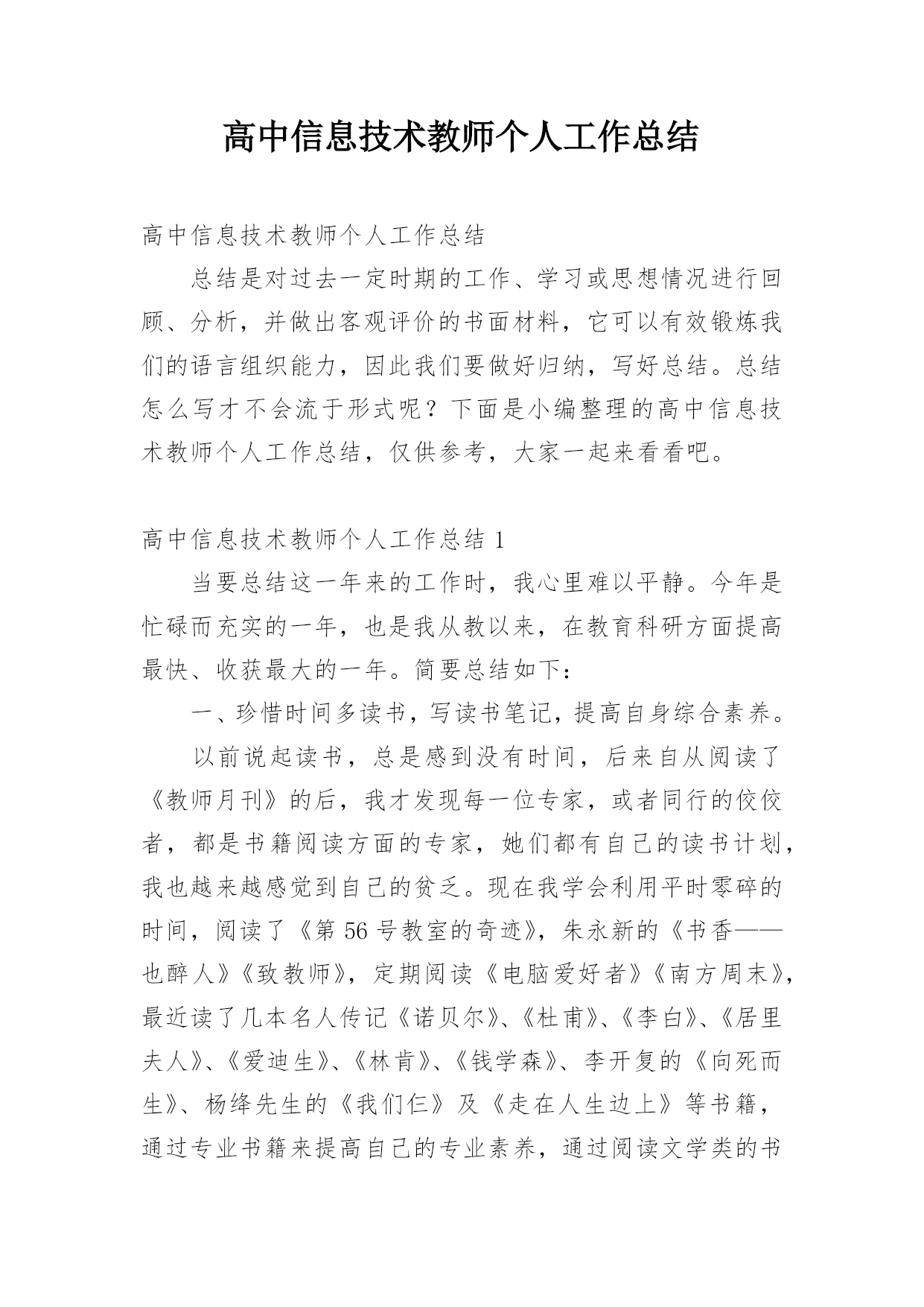 高中信息技术教师个人工作总结高中信息技术教师个人工作总结总结是对过去一定时期的工作、学习或思想情况进行回顾、分析,并做出客观评价的书面材料,它可以有效锻炼我们的语言组织能力,因此我们要做好归纳,写好总结。总结怎么写才不会流于形式呢?下面是小编整理的高中信息技术教师个人工作总结,仅供参考,大家一起来看看吧。高中信息技术教师个人工作总结1当要总结这一年来的工作时,我心里难以平静。今年是忙碌而充实的一年,也是我从教以来,在教育科研方面提高最快、收获最大的一年。简要总结如下:一、珍惜时间多读书,写读书笔记,提高自