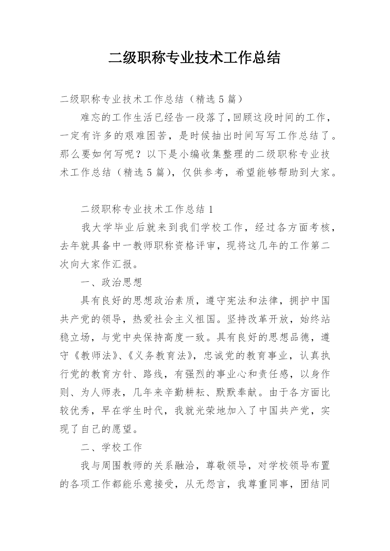 二级职称专业技术工作总结二级职称专业技术工作总结(精选5篇)难忘的工作生活已经告一段落了,回顾这段时间的工作,一定有许多的艰难困苦,是时候抽出时间写写工作总结了。那么要如何写呢?以下是小编收集整理的二级职称专业技术工作总结(精选5篇),仅供参考,希望能够帮助到大家。二级职称专业技术工作总结1我大学毕业后就来到我们学校工作,经过各方面考核,去年就具备中一教师职称资格评审,现将这几年的工作第二次向大家作汇报。一、政治思想具有良好的思想政治素质,遵守宪法和法律,拥护中国共产党的领导,热爱社会主义祖国。坚持改革开