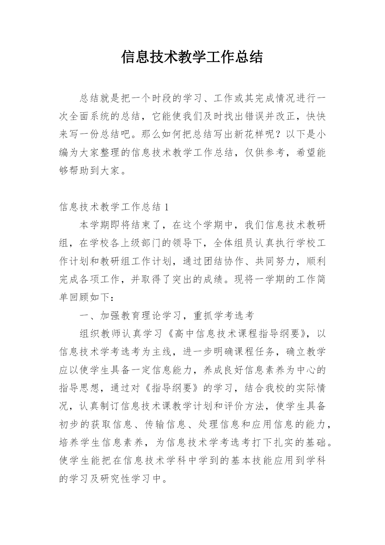 信息技术教学工作总结总结就是把一个时段的学习、工作或其完成情况进行一次全面系统的总结,它能使我们及时找出错误并改正,快快来写一份总结吧。那么如何把总结写出新花样呢?以下是小编为大家整理的信息技术教学工作总结,仅供参考,希望能够帮助到大家。信息技术教学工作总结1本学期即将结束了,在这个学期中,我们信息技术教研组,在学校各上级部门的领导下,全体组员认真执行学校工作计划和教研组工作计划,通过团结协作、共同努力,顺利完成各项工作,并取得了突出的成绩。现将一学期的工作简单回顾如下:一、加强教育理论学习,重抓学考选考