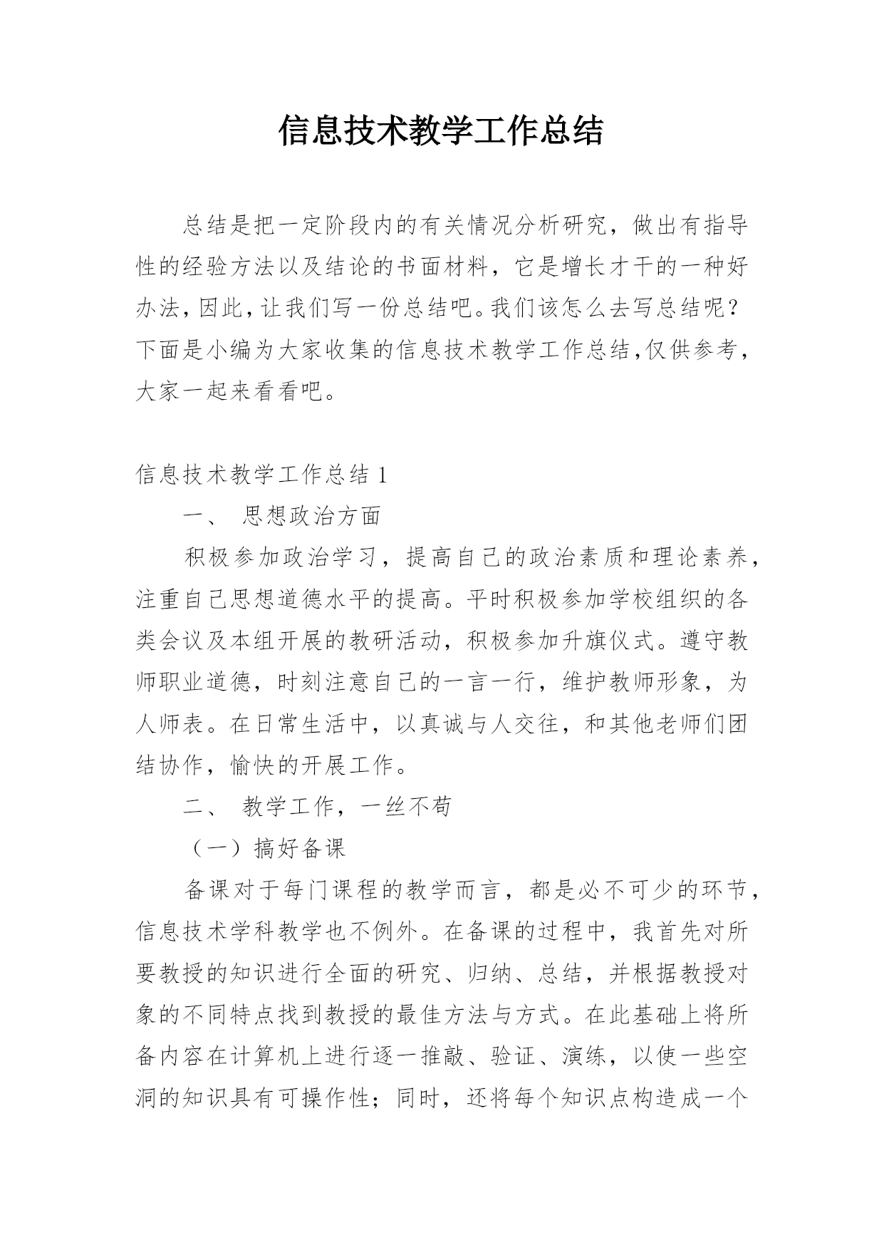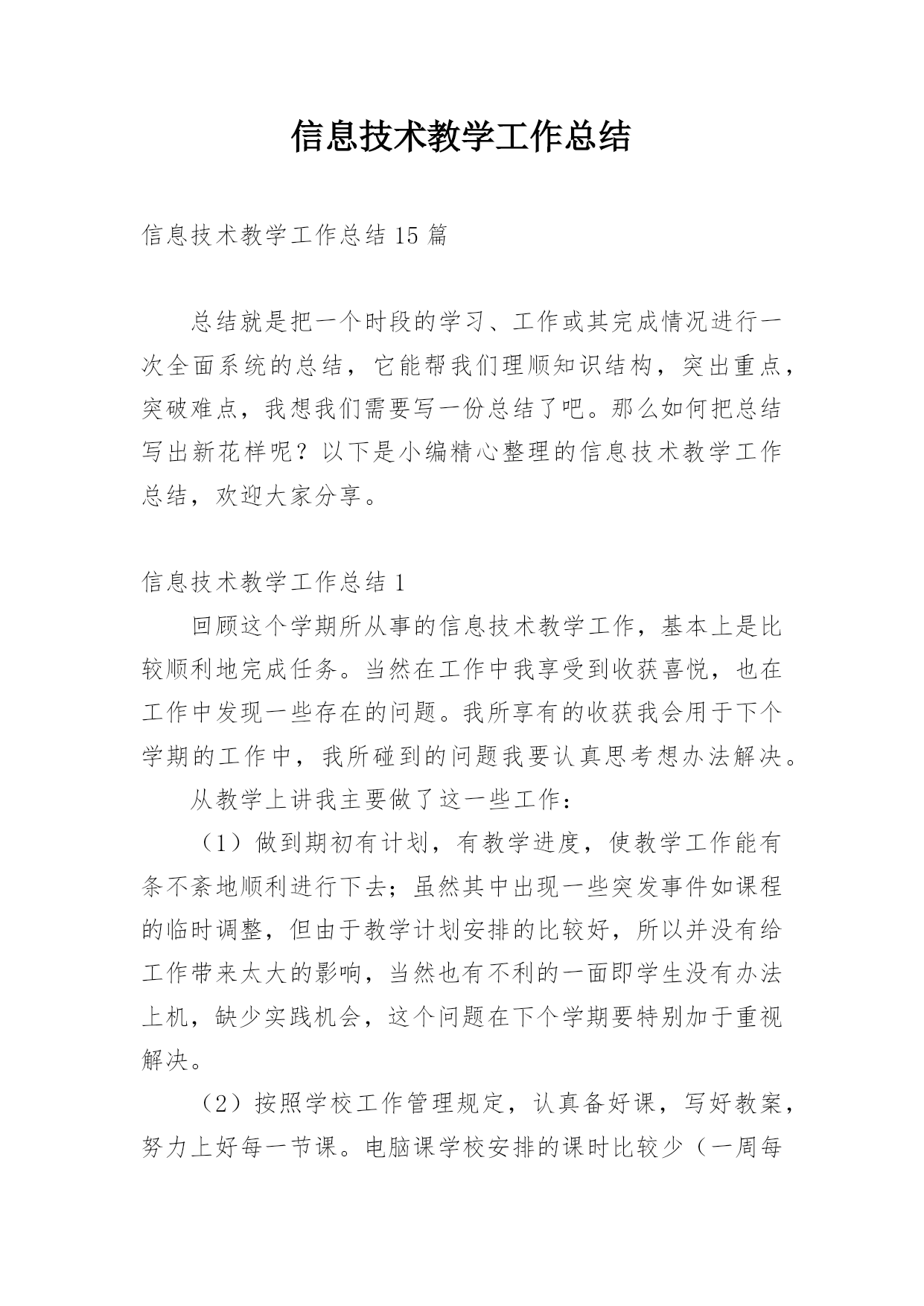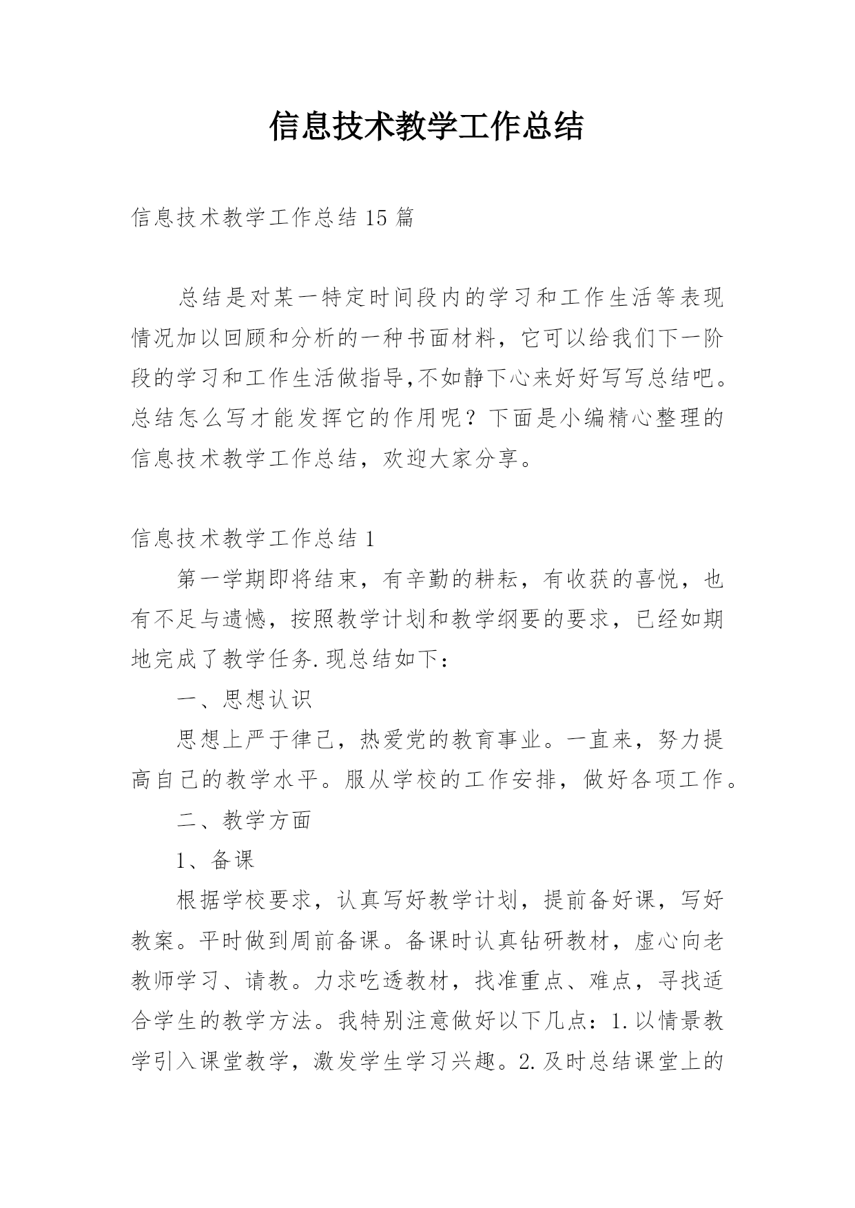 信息技术教学工作总结信息技术教学工作总结15篇总结是对某一特定时间段内的学习和工作生活等表现情况加以回顾和分析的一种书面材料,它可以给我们下一阶段的学习和工作生活做指导,不如静下心来好好写写总结吧。总结怎么写才能发挥它的作用呢?下面是小编精心整理的信息技术教学工作总结,欢迎大家分享。信息技术教学工作总结1第一学期即将结束,有辛勤的耕耘,有收获的喜悦,也有不足与遗憾,按照教学计划和教学纲要的要求,已经如期地完成了教学任务.现总结如下:一、思想认识思想上严于律己,热爱党的教育事业。一直来,努力提高自己的教学水
