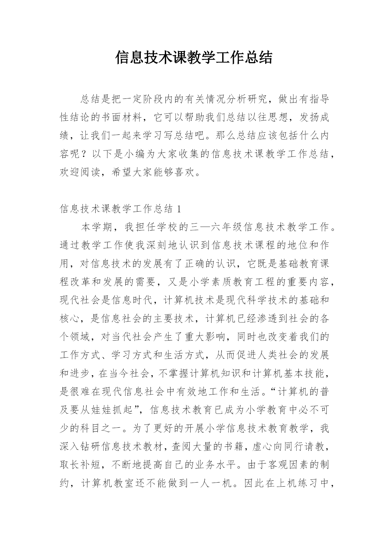 信息技术课教学工作总结总结是把一定阶段内的有关情况分析研究,做出有指导性结论的书面材料,它可以帮助我们总结以往思想,发扬成绩,让我们一起来学习写总结吧。那么总结应该包括什么内容呢?以下是小编为大家收集的信息技术课教学工作总结,欢迎阅读,希望大家能够喜欢。信息技术课教学工作总结1本学期,我担任学校的三—六年级信息技术教学工作。通过教学工作使我深刻地认识到信息技术课程的地位和作用,对信息技术的发展有了正确的认识,它既是基础教育课程改革和发展的需要,又是小学素质教育工程的重要内容,现代社会是信息时代,计算机技术