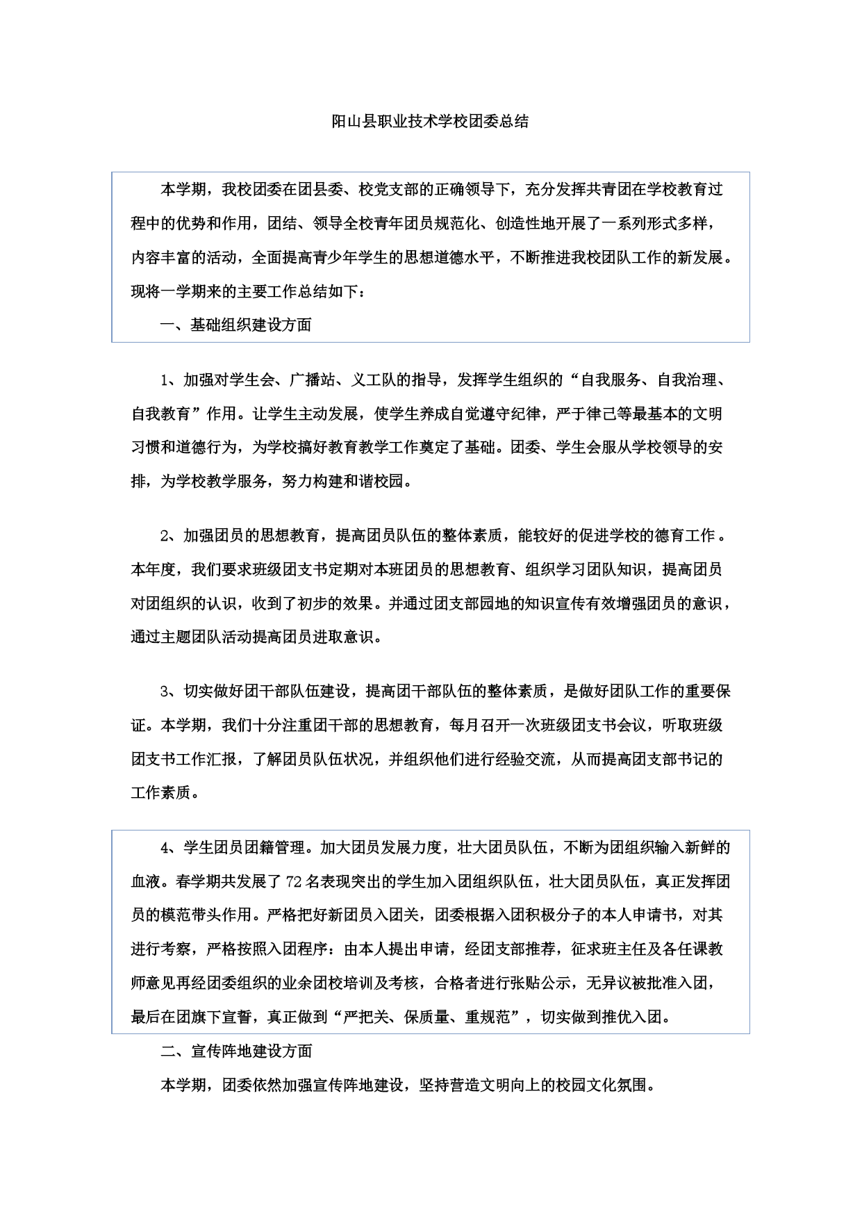 阳山县职业技术学校团委总结本学期,我校团委在团县委、校党支部的正确领导下,充分发挥共青团在学校教育过程中的优势和作用,团结、领导全校青年团员规范化、创造性地开展了一系列形式多样,内容丰富的活动,全面提高青少年学生的思想道德水平,不断推进我校团队工作的新发展。现将一学期来的主要工作总结如下:一、基础组织建设方面1、加强对学生会、广播站、义工队的指导,发挥学生组织的“自我服务、自我治理、自我教育”作用。让学生主动发展,使学生养成自觉遵守纪律,严于律己等最基本的文明习惯和道德行为,为学校搞好教育教学工作奠定了基