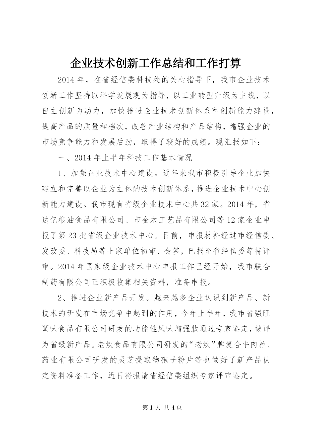 第PAGE\*Arabic\*MERGEFORMAT4页共NUMPAGES\*MERGEFORMAT4页企业技术创新工作总结和工作打算2014年,在省经信委科技处的关心指导下,我市企业技术创新工作坚持以科学发展观为指导,以工业转型升级为主线,以自主创新为动力,加快推进企业技术创新体系和创新能力建设,提高产品的质量和档次,改善产业结构和产品结构,增强企业的市场竞争能力和发展后劲,取得了较好的成绩。现汇报如下:一、2014年上半年科技工作基本情况1、加强企业技术中心建设。近年来我市积极引导企业加快