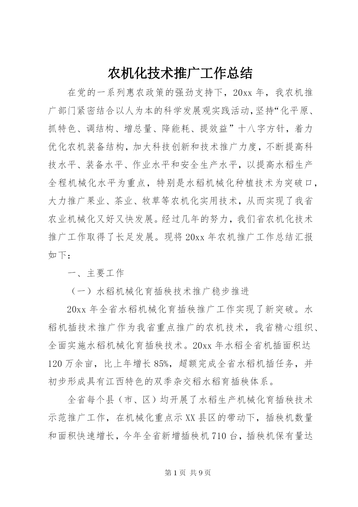 第PAGE\*Arabic\*MERGEFORMAT9页共NUMPAGES\*MERGEFORMAT9页农机化技术推广工作总结在党的一系列惠农政策的强劲支持下,20xx年,我农机推广部门紧密结合以人为本的科学发展观实践活动,坚持“化平原、抓特色、调结构、增总量、降能耗、提效益”十八字方针,着力优化农机装备结构,加大科技创新和技术推广力度,不断提高科技水平、装备水平、作业水平和安全生产水平,以提高水稻生产全程机械化水平为重点,特别是水稻机械化种植技术为突破口,大力推广果业、茶业、牧草等农机化实用