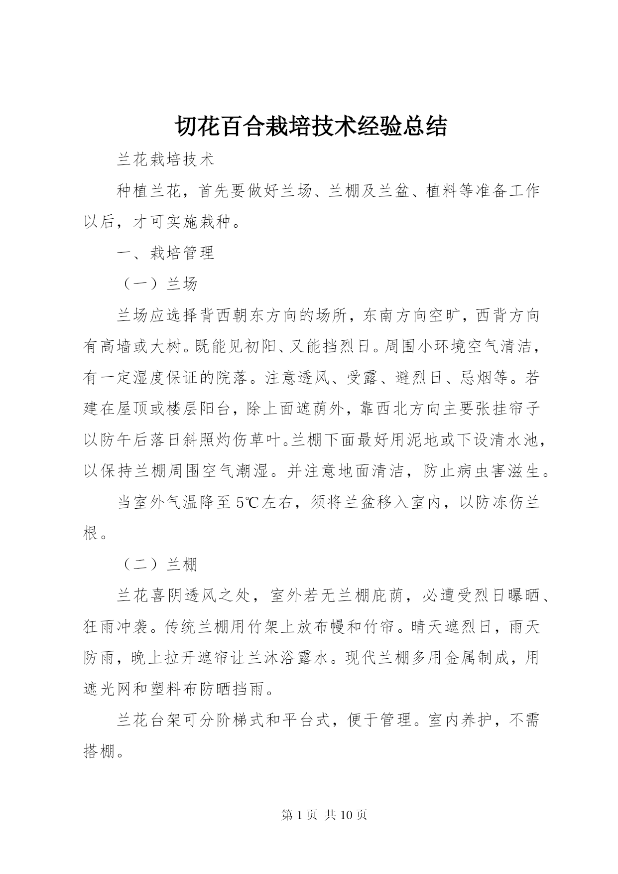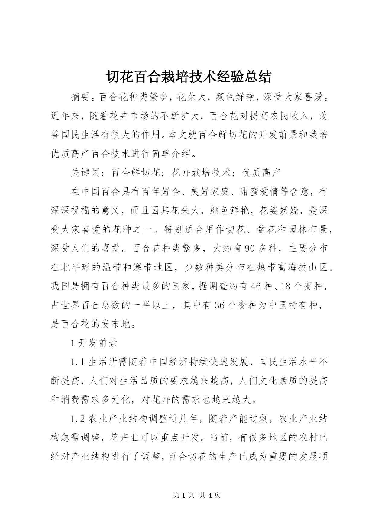 第PAGE\*Arabic\*MERGEFORMAT4页共NUMPAGES\*MERGEFORMAT4页切花百合栽培技术经验总结摘要。百合花种类繁多,花朵大,颜色鲜艳,深受大家喜爱。近年来,随着花卉市场的不断扩大,百合花对提高农民收入,改善国民生活有很大的作用。本文就百合鲜切花的开发前景和栽培优质高产百合技术进行简单介绍。关键词:百合鲜切花;花卉栽培技术;优质高产在中国百合具有百年好合、美好家庭、甜蜜爱情等含意,有深深祝福的意义,而且因其花朵大,颜色鲜艳,花姿妖娆,是深受大家喜爱的花种之一。特