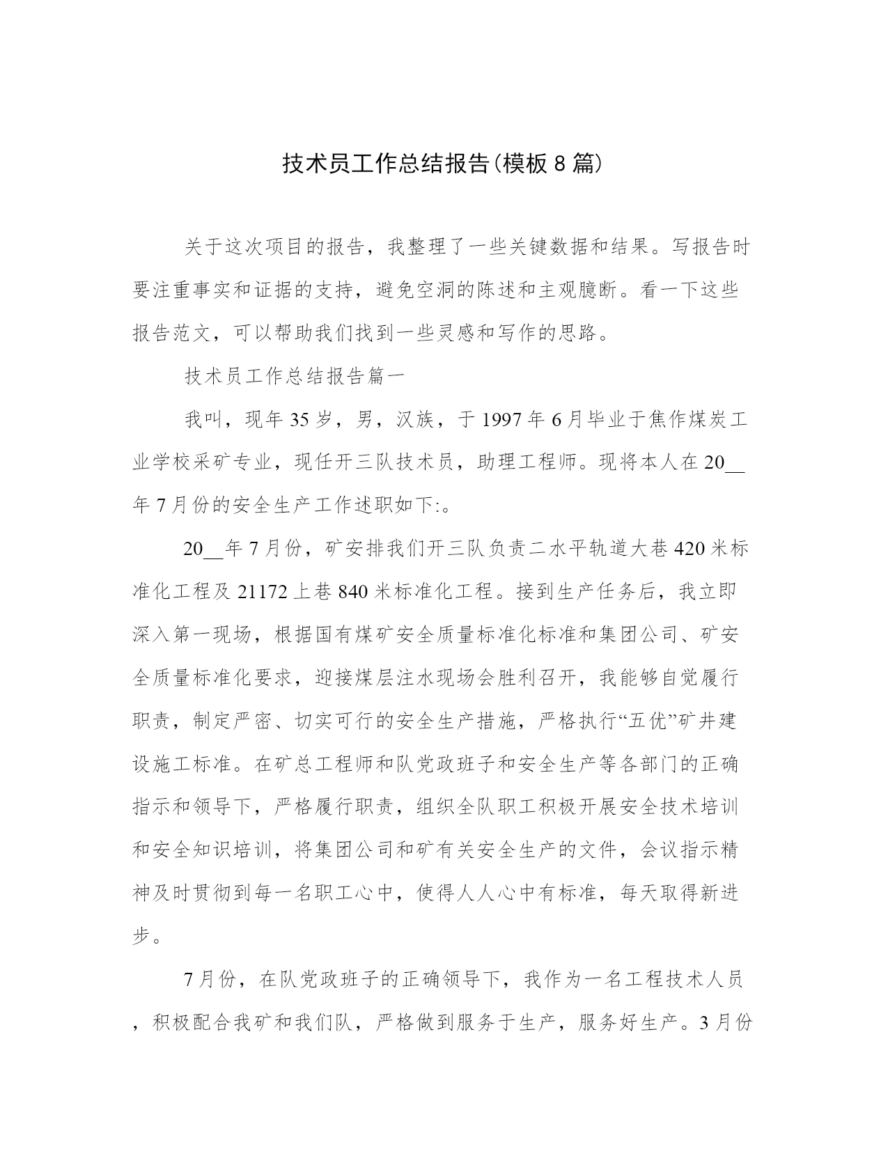 技术员工作总结报告(模板8篇)关于这次项目的报告,我整理了一些关键数据和结果。写报告时要注重事实和证据的支持,避免空洞的陈述和主观臆断。看一下这些报告范文,可以帮助我们找到一些灵感和写作的思路。技术员工作总结报告篇一我叫,现年35岁,男,汉族,于1997年6月毕业于焦作煤炭工业学校采矿专业,现任开三队技术员,助理工程师。现将本人在20__年7月份的安全生产工作述职如下:。20__年7月份,矿安排我们开三队负责二水平轨道大巷420米标准化工程及21172上巷840米标准化工程。接到生产任务后,我立即深入第一