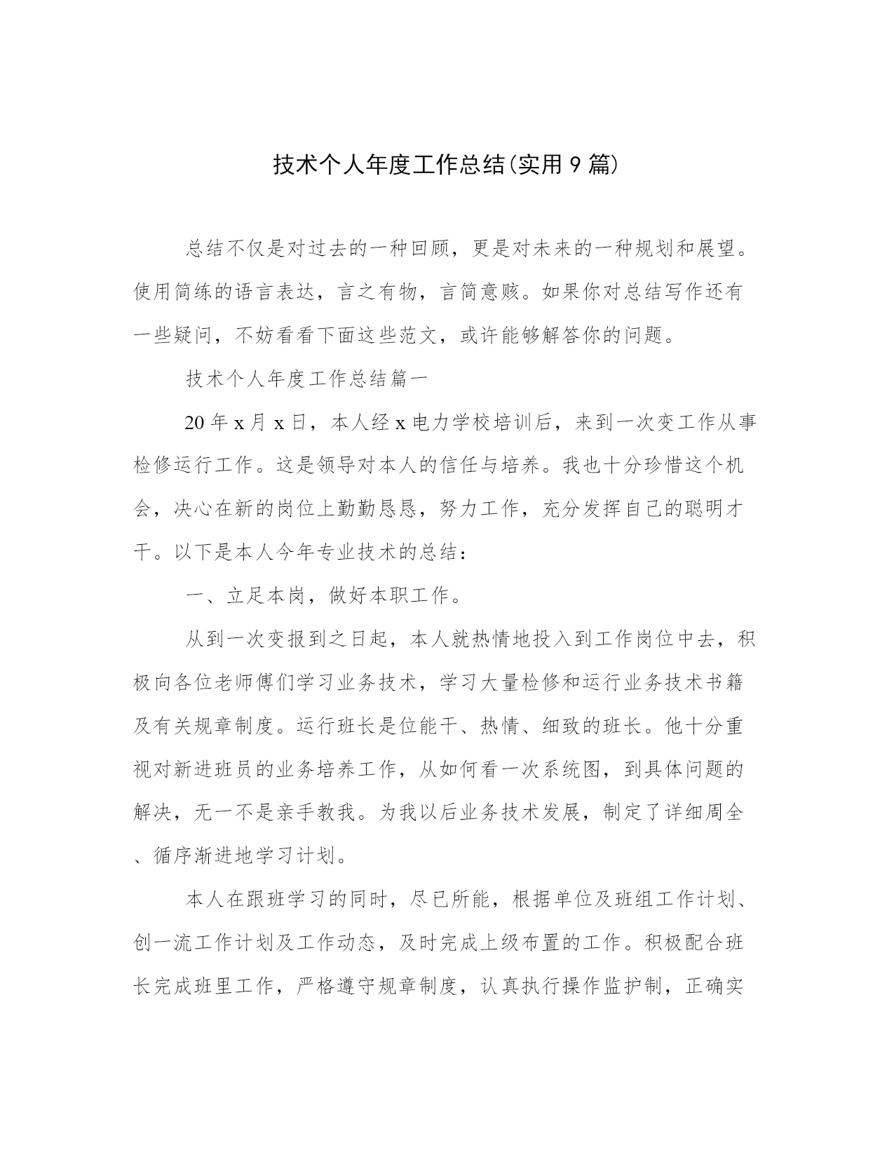 技术个人年度工作总结(实用9篇)总结不仅是对过去的一种回顾,更是对未来的一种规划和展望。使用简练的语言表达,言之有物,言简意赅。如果你对总结写作还有一些疑问,不妨看看下面这些范文,或许能够解答你的问题。技术个人年度工作总结篇一20年x月x日,本人经x电力学校培训后,来到一次变工作从事检修运行工作。这是领导对本人的信任与培养。我也十分珍惜这个机会,决心在新的岗位上勤勤恳恳,努力工作,充分发挥自己的聪明才干。以下是本人今年专业技术的总结:一、立足本岗,做好本职工作。从到一次变报到之日起,本人就热情地投入到工作
