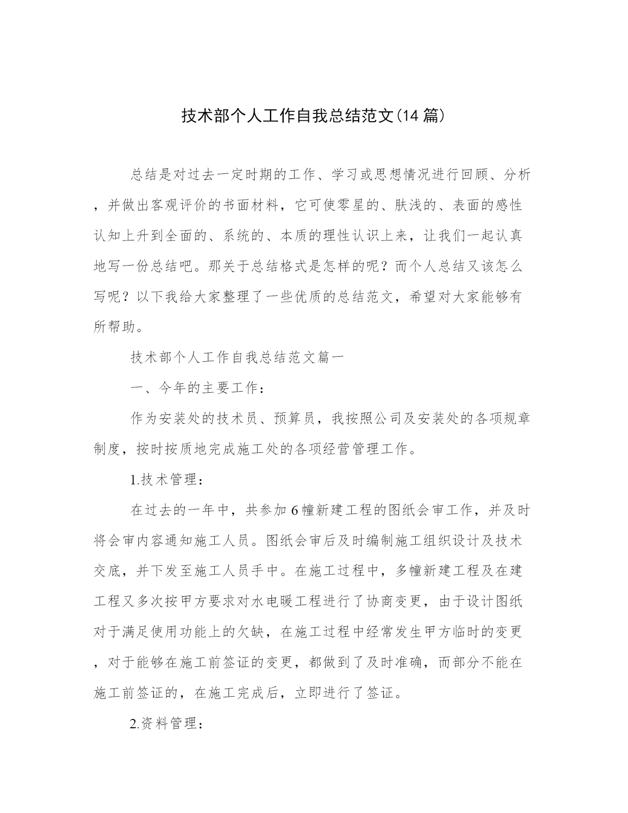 技术部个人工作自我总结范文(14篇)总结是对过去一定时期的工作、学习或思想情况进行回顾、分析,并做出客观评价的书面材料,它可使零星的、肤浅的、表面的感性认知上升到全面的、系统的、本质的理性认识上来,让我们一起认真地写一份总结吧。那关于总结格式是怎样的呢?而个人总结又该怎么写呢?以下我给大家整理了一些优质的总结范文,希望对大家能够有所帮助。技术部个人工作自我总结范文篇一一、今年的主要工作:作为安装处的技术员、预算员,我按照公司及安装处的各项规章制度,按时按质地完成施工处的各项经营管理工作。1.技术管理:在过