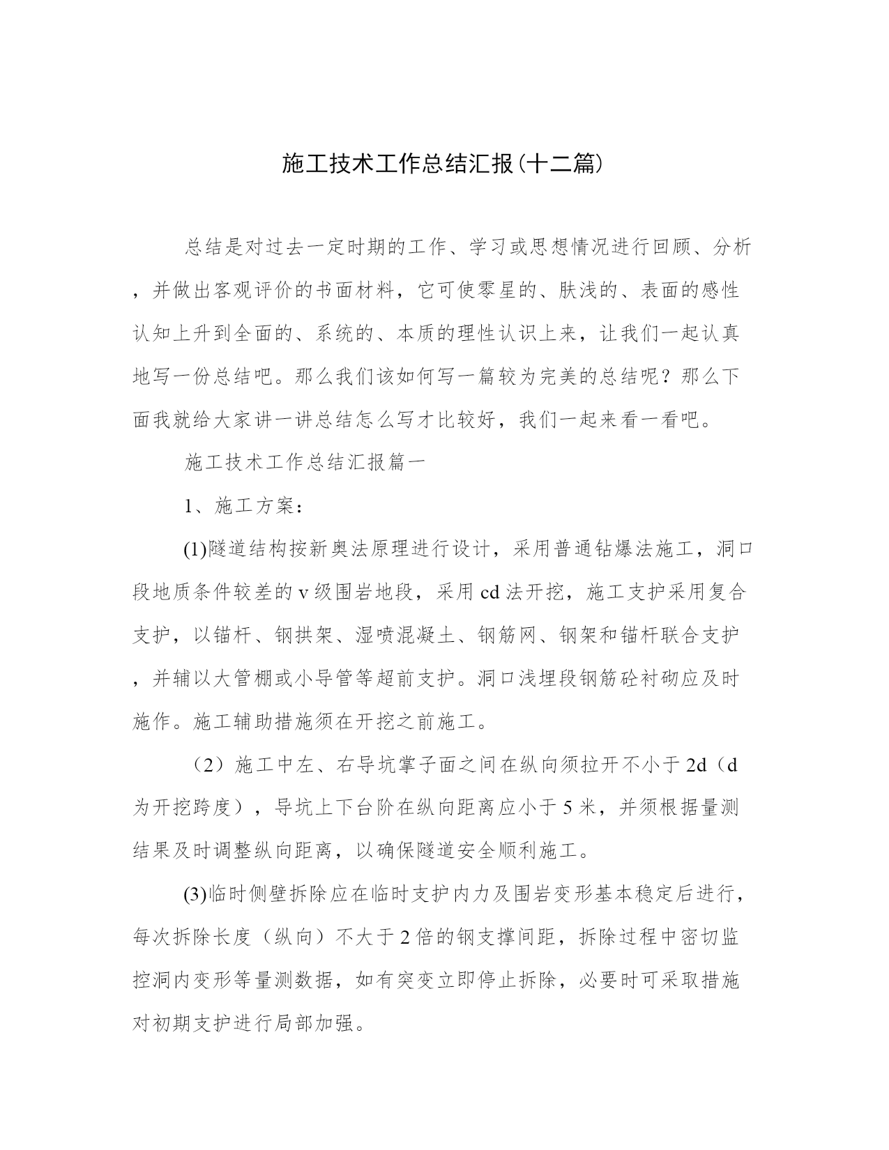 施工技术工作总结汇报(十二篇)总结是对过去一定时期的工作、学习或思想情况进行回顾、分析,并做出客观评价的书面材料,它可使零星的、肤浅的、表面的感性认知上升到全面的、系统的、本质的理性认识上来,让我们一起认真地写一份总结吧。那么我们该如何写一篇较为完美的总结呢?那么下面我就给大家讲一讲总结怎么写才比较好,我们一起来看一看吧。施工技术工作总结汇报篇一1、施工方案:(1)隧道结构按新奥法原理进行设计,采用普通钻爆法施工,洞口段地质条件较差的v级围岩地段,采用cd法开挖,施工支护采用复合支护,以锚杆、钢拱架、湿喷