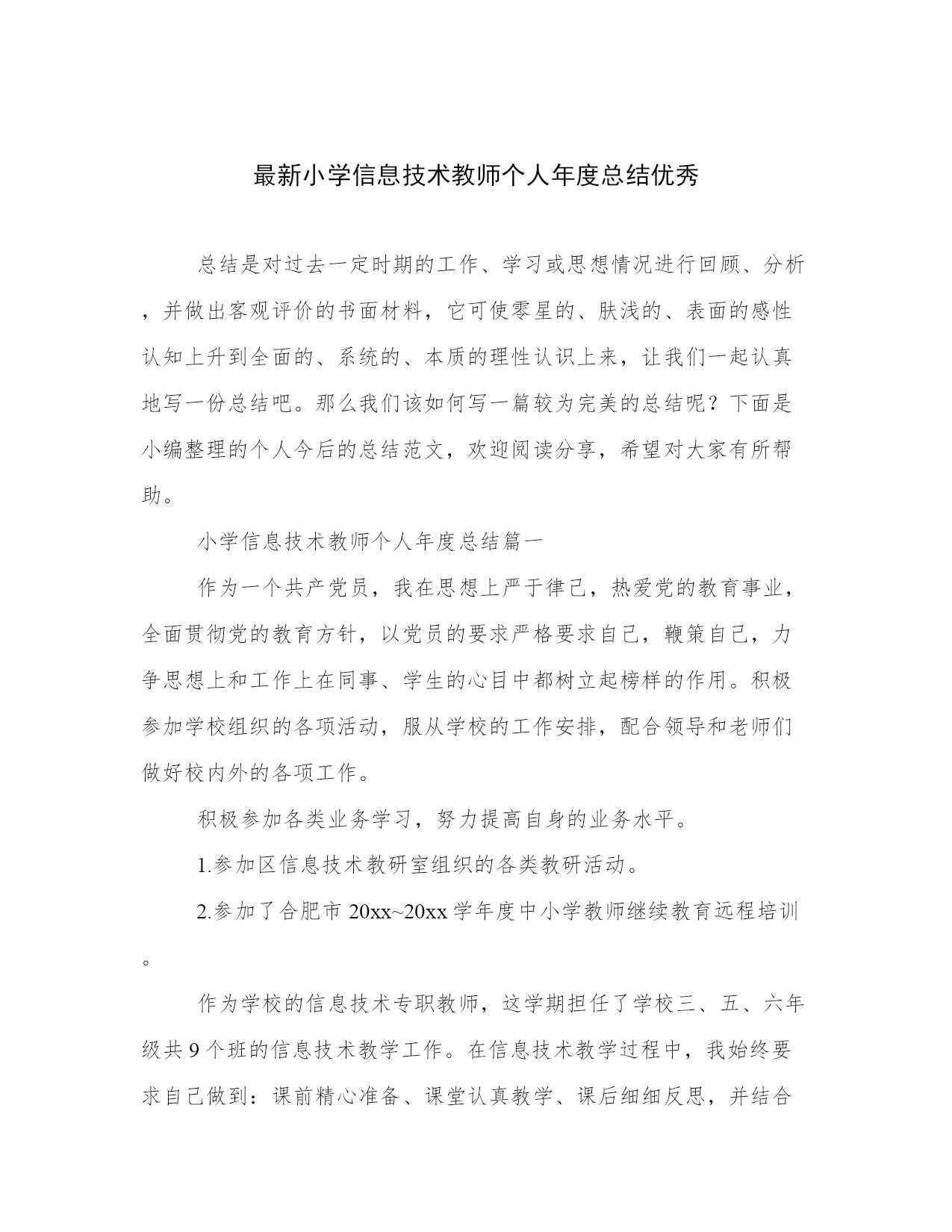 最新小学信息技术教师个人年度总结优秀总结是对过去一定时期的工作、学习或思想情况进行回顾、分析,并做出客观评价的书面材料,它可使零星的、肤浅的、表面的感性认知上升到全面的、系统的、本质的理性认识上来,让我们一起认真地写一份总结吧。那么我们该如何写一篇较为完美的总结呢?下面是小编整理的个人今后的总结范文,欢迎阅读分享,希望对大家有所帮助。小学信息技术教师个人年度总结篇一作为一个共产党员,我在思想上严于律己,热爱党的教育事业,全面贯彻党的教育方针,以党员的要求严格要求自己,鞭策自己,力争思想上和工作上在同事、学