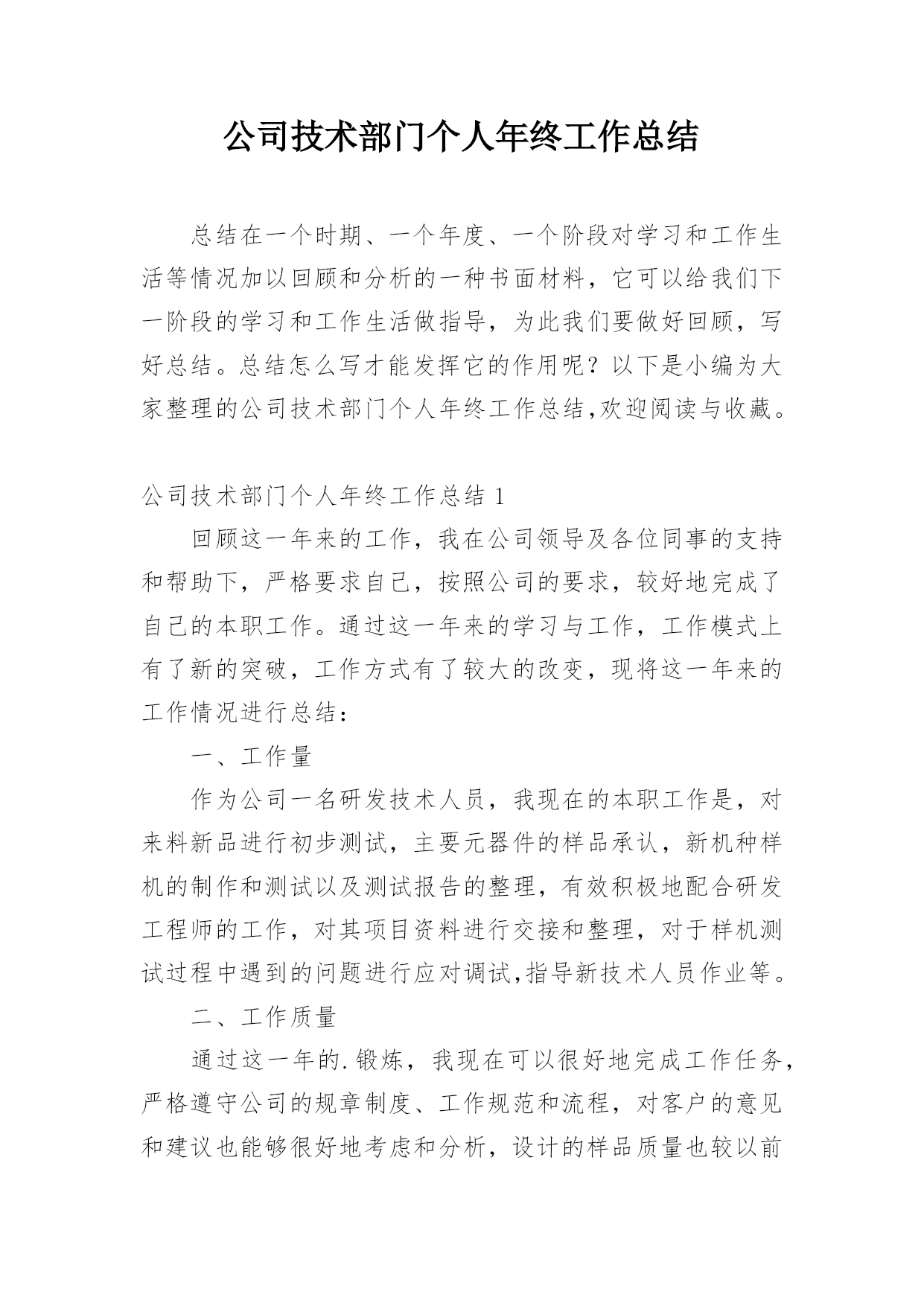 公司技术部门个人年终工作总结总结在一个时期、一个年度、一个阶段对学习和工作生活等情况加以回顾和分析的一种书面材料,它可以给我们下一阶段的学习和工作生活做指导,为此我们要做好回顾,写好总结。总结怎么写才能发挥它的作用呢?以下是小编为大家整理的公司技术部门个人年终工作总结,欢迎阅读与收藏。公司技术部门个人年终工作总结1回顾这一年来的工作,我在公司领导及各位同事的支持和帮助下,严格要求自己,按照公司的要求,较好地完成了自己的本职工作。通过这一年来的学习与工作,工作模式上有了新的突破,工作方式有了较大的改变,现将