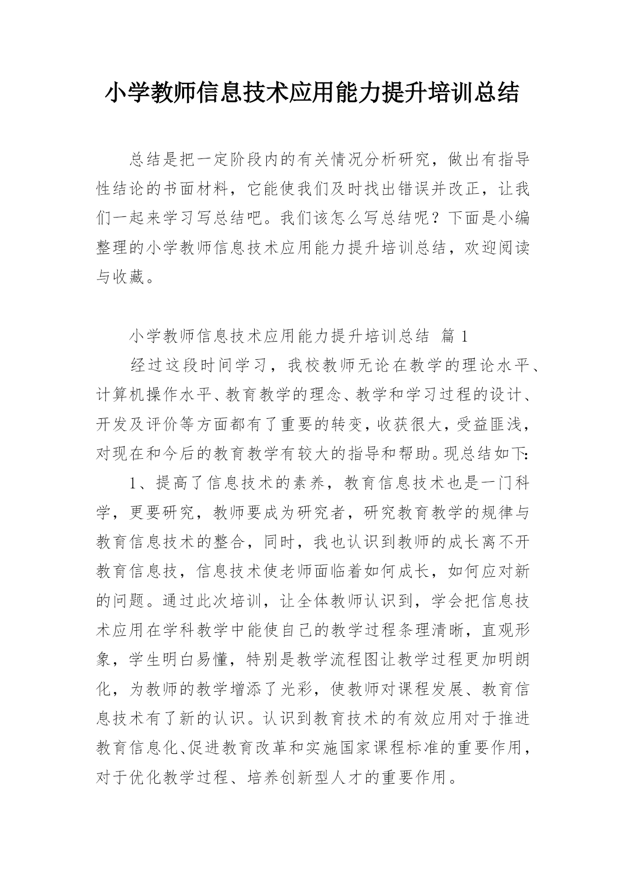 小学教师信息技术应用能力提升培训总结总结是把一定阶段内的有关情况分析研究,做出有指导性结论的书面材料,它能使我们及时找出错误并改正,让我们一起来学习写总结吧。我们该怎么写总结呢?下面是小编整理的小学教师信息技术应用能力提升培训总结,欢迎阅读与收藏。小学教师信息技术应用能力提升培训总结篇1经过这段时间学习,我校教师无论在教学的理论水平、计算机操作水平、教育教学的理念、教学和学习过程的设计、开发及评价等方面都有了重要的转变,收获很大,受益匪浅,对现在和今后的教育教学有较大的指导和帮助。现总结如下:1、提高了信
