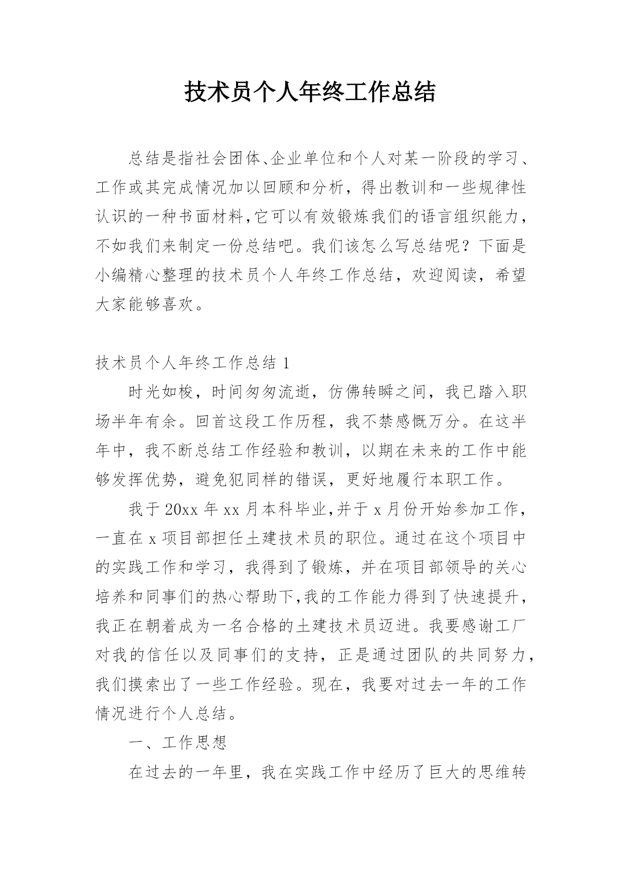 技术员个人年终工作总结总结是指社会团体、企业单位和个人对某一阶段的学习、工作或其完成情况加以回顾和分析,得出教训和一些规律性认识的一种书面材料,它可以有效锻炼我们的语言组织能力,不如我们来制定一份总结吧。我们该怎么写总结呢?下面是小编精心整理的技术员个人年终工作总结,欢迎阅读,希望大家能够喜欢。技术员个人年终工作总结1时光如梭,时间匆匆流逝,仿佛转瞬之间,我已踏入职场半年有余。回首这段工作历程,我不禁感慨万分。在这半年中,我不断总结工作经验和教训,以期在未来的工作中能够发挥优势,避免犯同样的错误,更好地履