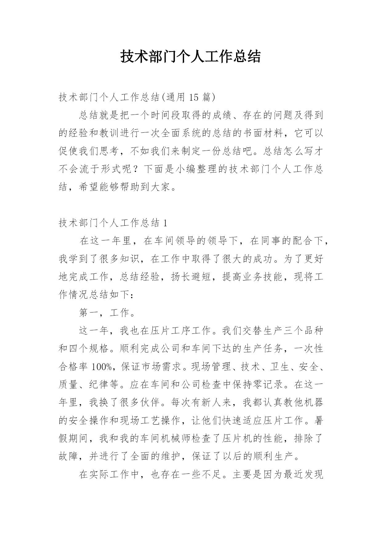 技术部门个人工作总结技术部门个人工作总结(通用15篇)总结就是把一个时间段取得的成绩、存在的问题及得到的经验和教训进行一次全面系统的总结的书面材料,它可以促使我们思考,不如我们来制定一份总结吧。总结怎么写才不会流于形式呢?下面是小编整理的技术部门个人工作总结,希望能够帮助到大家。技术部门个人工作总结1在这一年里,在车间领导的领导下,在同事的配合下,我学到了很多知识,在工作中取得了很大的成功。为了更好地完成工作,总结经验,扬长避短,提高业务技能,现将工作情况总结如下:第一,工作。这一年,我也在压片工序工作。