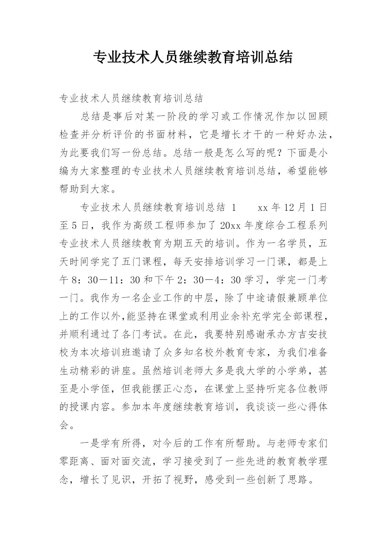 专业技术人员继续教育培训总结专业技术人员继续教育培训总结总结是事后对某一阶段的学习或工作情况作加以回顾检查并分析评价的书面材料,它是增长才干的一种好办法,为此要我们写一份总结。总结一般是怎么写的呢?下面是小编为大家整理的专业技术人员继续教育培训总结,希望能够帮助到大家。专业技术人员继续教育培训总结1xx年12月1日至5日,我作为高级工程师参加了20xx年度综合工程系列专业技术人员继续教育为期五天的培训。作为一名学员,五天时间学完了五门课程,每天安排培训学习一门课,都是上午8:30-11:30和下午2:30