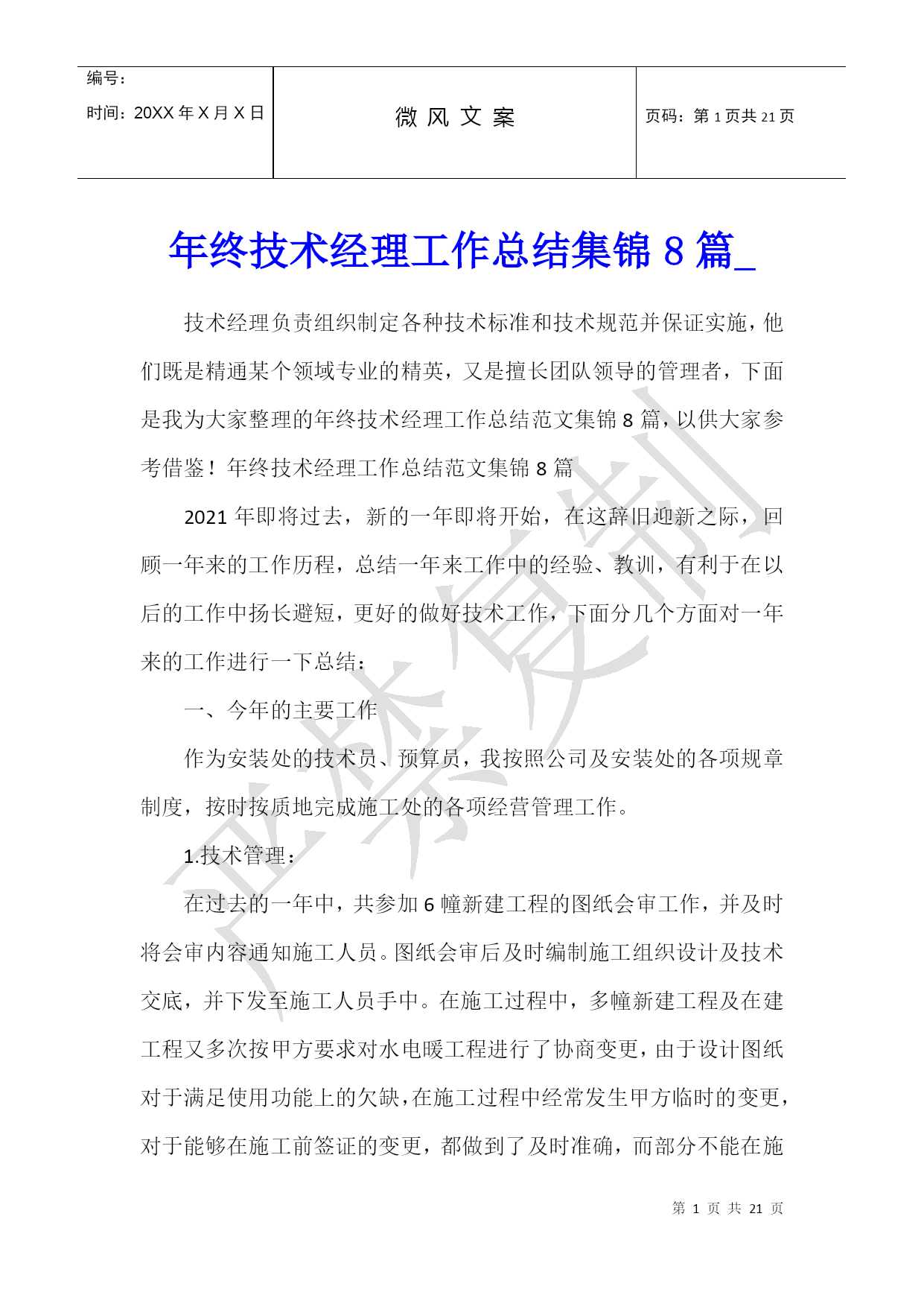 编号:时间:20XX年X月X日微风文案页码:第PAGE21页共NUMPAGES21页第PAGE\*MERGEFORMAT21页共NUMPAGES\*MERGEFORMAT21页年终技术经理工作总结集锦8篇_技术经理负责组织制定各种技术标准和技术规范并保证实施,他们既是精通某个领域专业的精英,又是擅长团队领导的管理者,下面是我为大家整理的年终技术经理工作总结范文集锦8篇,以供大家参考借鉴!年终技术经理工作总结范文集锦8篇2021年即将过去,新的一年即将开始,在这辞旧迎新之际,回顾一年