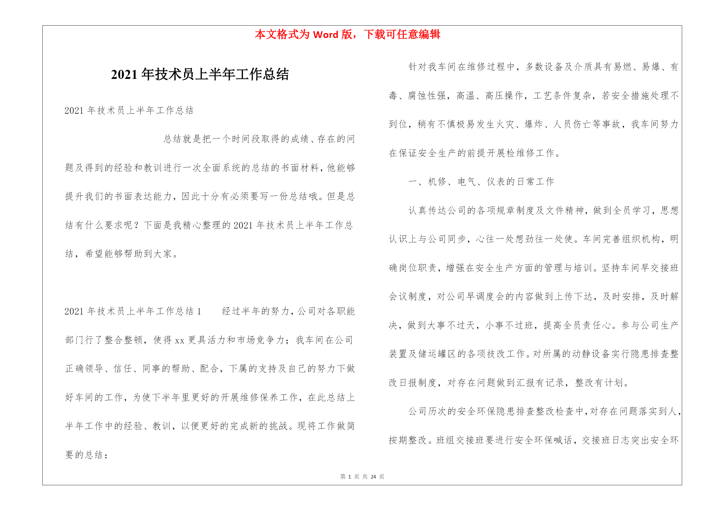 本文格式为Word版,下载可任意编辑第PAGE\*MERGEFORMAT24页共NUMPAGES\*MERGEFORMAT24页2021年技术员上半年工作总结2021年技术员上半年工作总结总结就是把一个时间段取得的成绩、存在的问题及得到的经验和教训进行一次全面系统的总结的书面材料,他能够提升我们的书面表达能力,因此十分有必须要写一份总结哦。但是总结有什么要求呢?下面是我精心整理的2021年技术员上半年工作总结,希望能够帮助到大家。2021年技术员上半年工作总结1经过半年的努力,公司对各职能部门