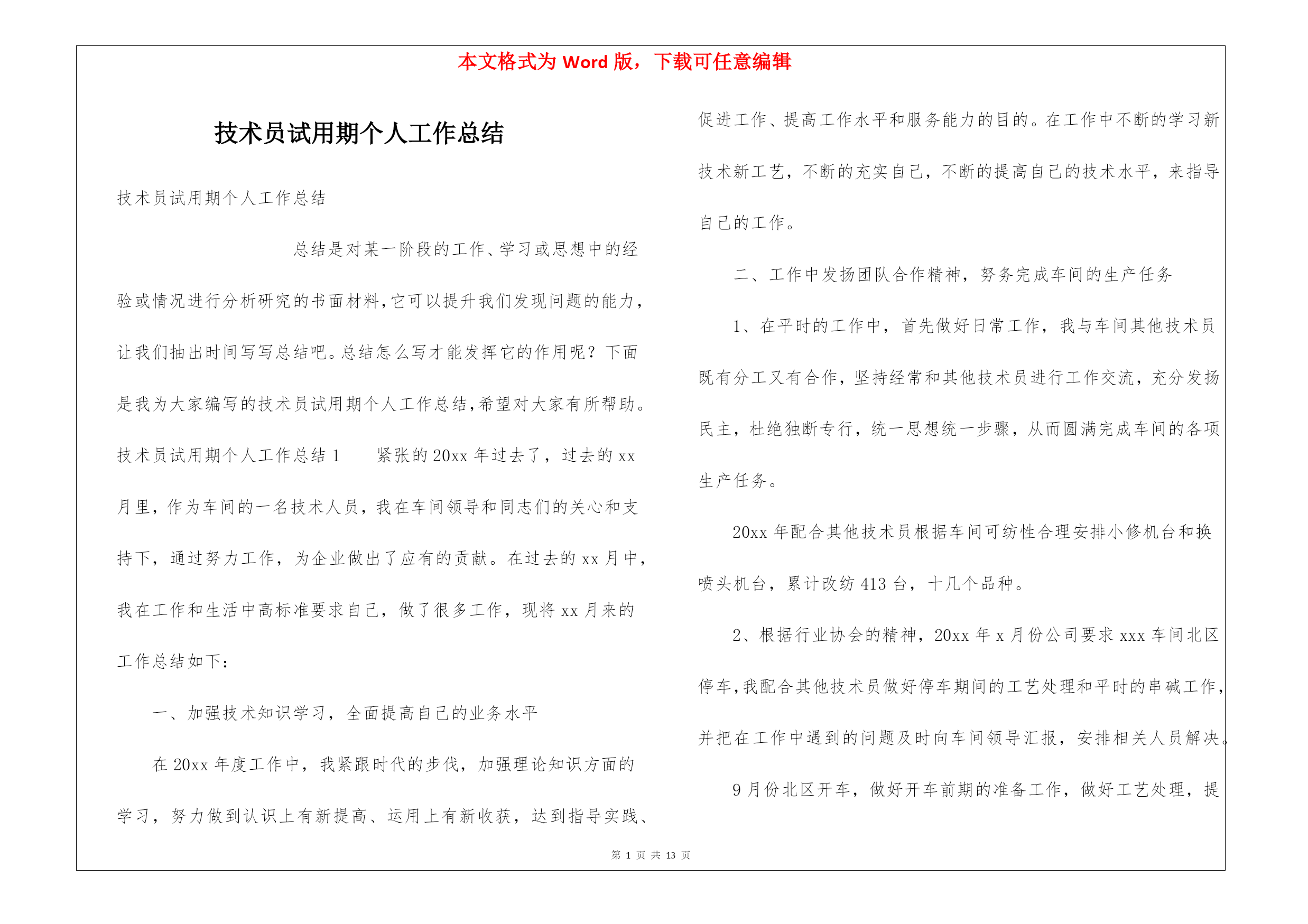 本文格式为Word版,下载可任意编辑第PAGE\*MERGEFORMAT13页共NUMPAGES\*MERGEFORMAT13页技术员试用期个人工作总结技术员试用期个人工作总结总结是对某一阶段的工作、学习或思想中的经验或情况进行分析研究的书面材料,它可以提升我们发现问题的能力,让我们抽出时间写写总结吧。总结怎么写才能发挥它的作用呢?下面是我为大家编写的技术员试用期个人工作总结,希望对大家有所帮助。技术员试用期个人工作总结1紧张的20xx年过去了,过去的xx月里,作为车间的一名技术人员,我在车间