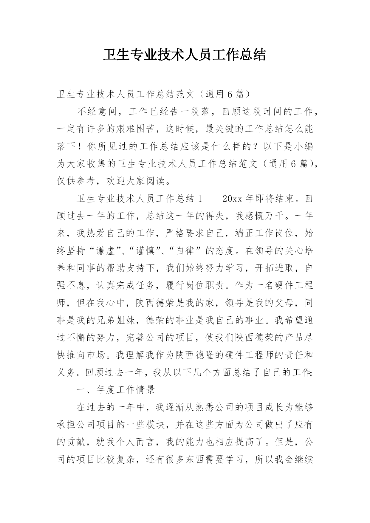 卫生专业技术人员工作总结卫生专业技术人员工作总结范文(通用6篇)不经意间,工作已经告一段落,回顾这段时间的工作,一定有许多的艰难困苦,这时候,最关键的工作总结怎么能落下!你所见过的工作总结应该是什么样的?以下是小编为大家收集的卫生专业技术人员工作总结范文(通用6篇),仅供参考,欢迎大家阅读。卫生专业技术人员工作总结120xx年即将结束。回顾过去一年的工作,总结这一年的得失,我感慨万千。一年来,我热爱自己的工作,严格要求自己,端正工作岗位,始终坚持“谦虚”、“谨慎”、“自律”的态度。在领导的关心培养和同事的