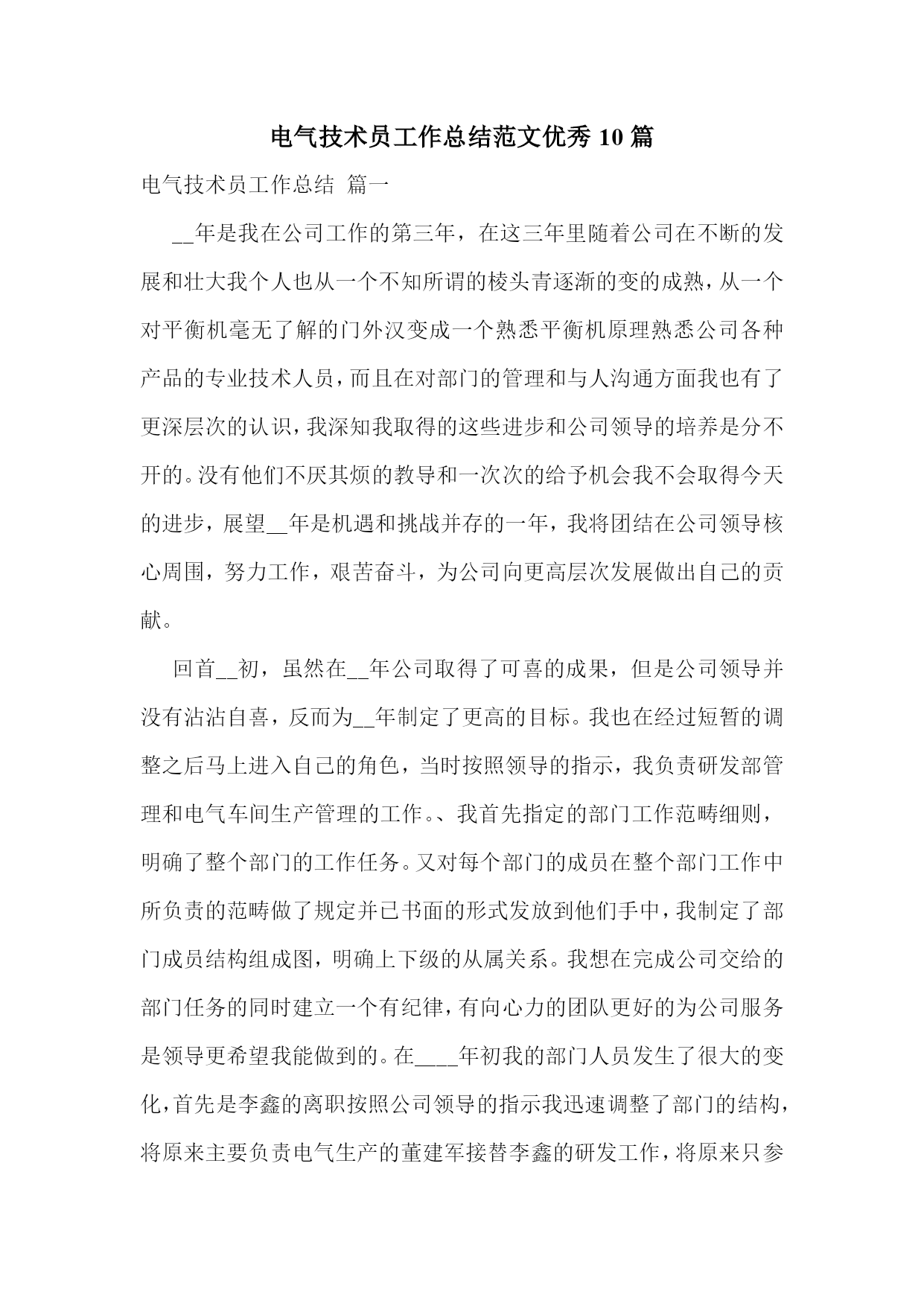 电气技术员工作总结范文优秀10篇电气技术员工作总结篇一__年是我在公司工作的第三年,在这三年里随着公司在不断的发展和壮大我个人也从一个不知所谓的棱头青逐渐的变的成熟,从一个对平衡机毫无了解的门外汉变成一个熟悉平衡机原理熟悉公司各种产品的专业技术人员,而且在对部门的管理和与人沟通方面我也有了更深层次的认识,我深知我取得的这些进步和公司领导的培养是分不开的。没有他们不厌其烦的教导和一次次的给予机会我不会取得今天的进步,展望__年是机遇和挑战并存的一年,我将团结在公司领导核心周围,努力工作,艰苦奋斗,为公司向更