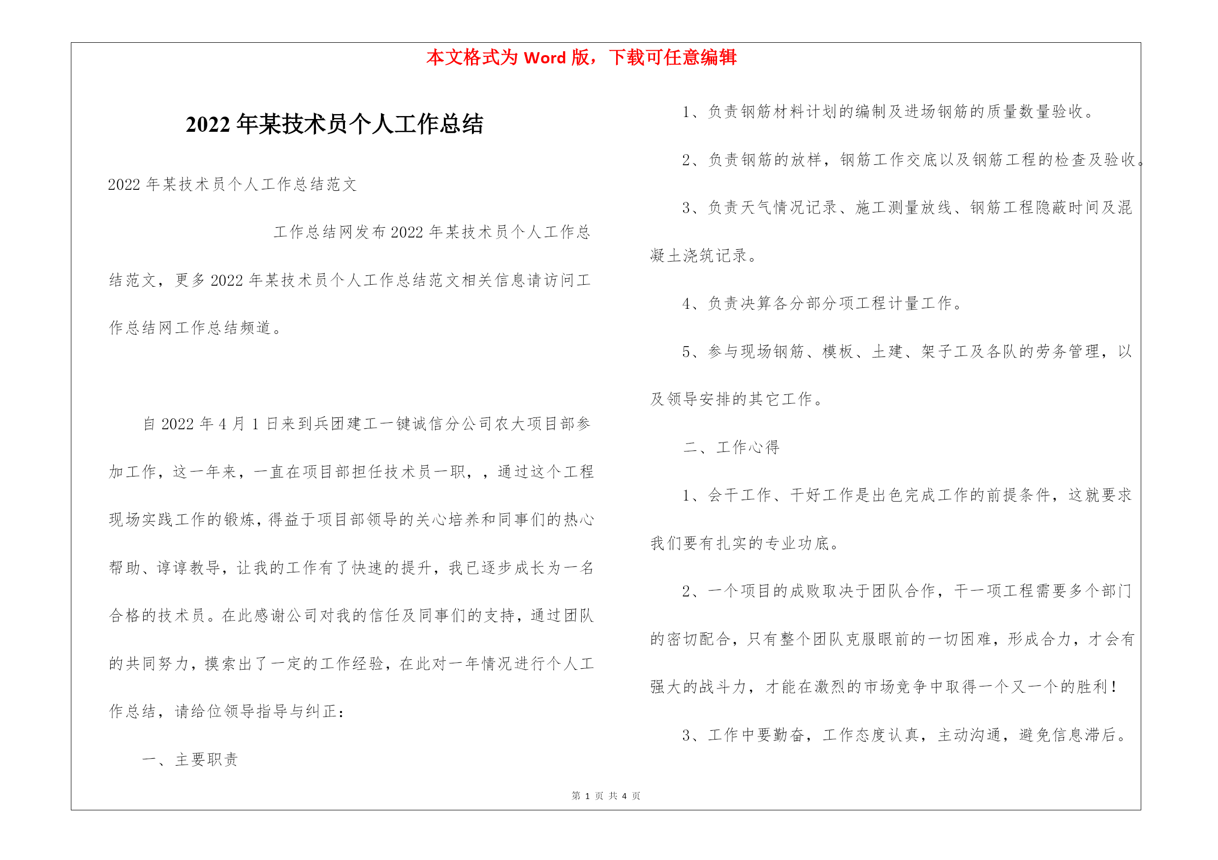 本文格式为Word版,下载可任意编辑第PAGE\*MERGEFORMAT4页共NUMPAGES\*MERGEFORMAT4页2022年某技术员个人工作总结2022年某技术员个人工作总结范文工作总结网发布2022年某技术员个人工作总结范文,更多2022年某技术员个人工作总结范文相关信息请访问工作总结网工作总结频道。自2022年4月1日来到兵团建工一键诚信分公司农大项目部参加工作,这一年来,一直在项目部担任技术员一职,,通过这个工程现场实践工作的锻炼,得益于项目部领导的关心培养和同事们的热心帮助、
