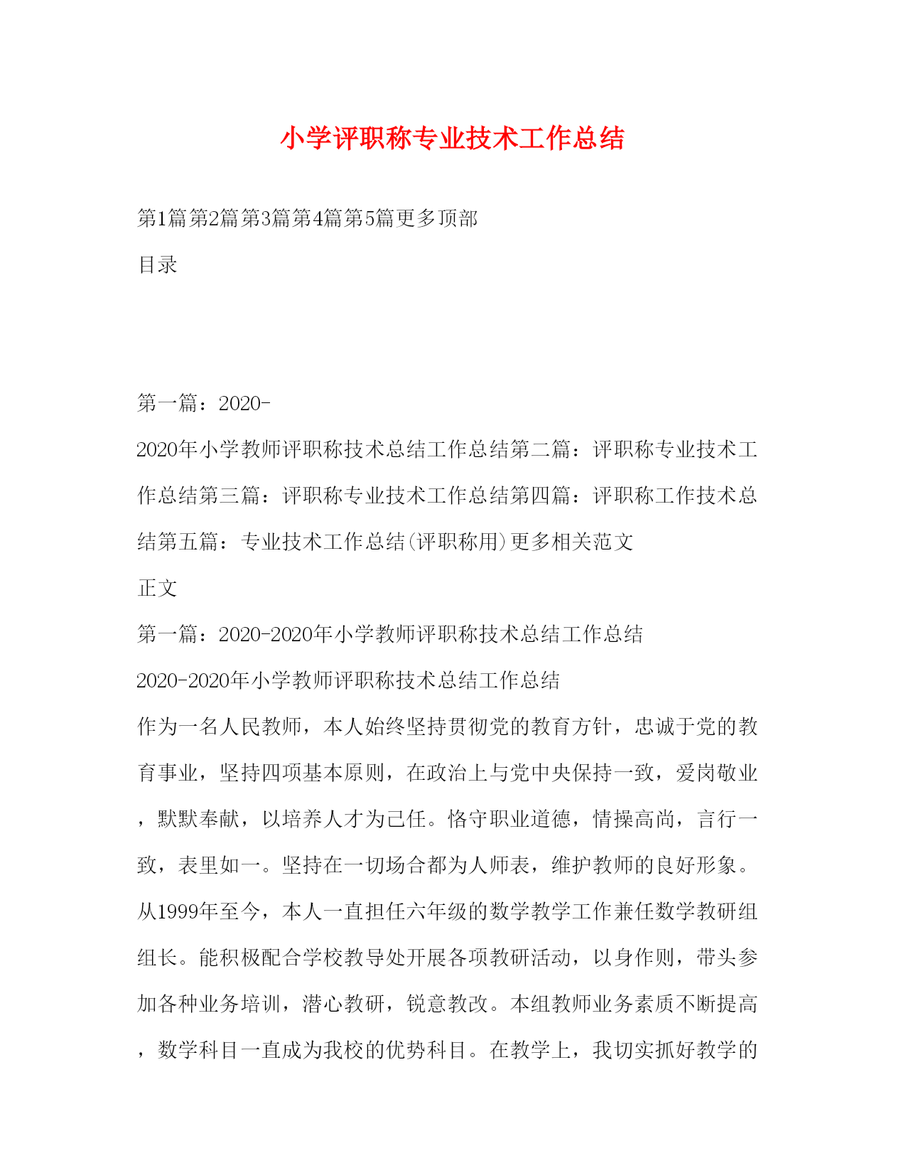 PAGE此资料由网络收集而来,如有侵权请告知上传者立即删除。资料共分享,我们负责传递知识。小学评职称专业技术工作总结第1篇第2篇第3篇第4篇第5篇更多顶部目录第一篇:2020-2020年小学教师评职称技术总结工作总结第二篇:评职称专业技术工作总结第三篇:评职称专业技术工作总结第四篇:评职称工作技术总结第五篇:专业技术工作总结(评职称用)更多相关范文正文第一篇:2020-2020年小学教师评职称技术总结工作总结2020-2020年小学教师评职称技术总结工作总结作为一名人民教师,本人始终坚持贯彻党的教育