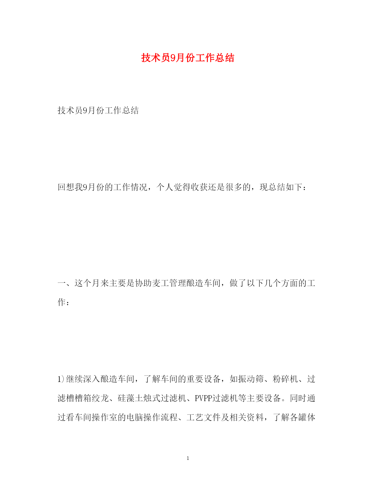 此资料由网络收集而来,如有侵权请告知上传者立即删除。资料共分享,我们负责传递知识。PAGEPAGE6技术员9月份工作总结技术员9月份工作总结回想我9月份的工作情况,个人觉得收获还是很多的,现总结如下:一、这个月来主要是协助麦工管理酿造车间,做了以下几个方面的工作:1)继续深入酿造车间,了解车间的重要设备,如振动筛、粉碎机、过滤槽槽箱绞龙、硅藻土烛式过滤机、PVPP过滤机等主要设备。同时通过看车间操作室的电脑操作流程、工艺文件及相关资料,了解各罐体、管道、阀门、泵的作用。因而,相比上个月,现在对