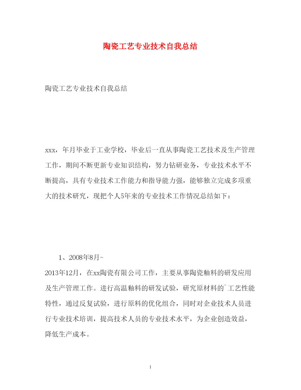 此资料由网络收集而来,如有侵权请告知上传者立即删除。资料共分享,我们负责传递知识。PAGEPAGE3陶瓷工艺专业技术自我总结陶瓷工艺专业技术自我总结xxx,年月毕业于工业学校,毕业后一直从事陶瓷工艺技术及生产管理工作,期间不断更新专业知识结构,努力钻研业务,专业技术水平不断提高,具有专业技术工作能力和指导能力强,能够独立完成多项重大的技术研究,现把个人5年来的专业技术工作情况总结如下:1、2008年8月-2013年12月,在xx陶瓷有限公司工作,主要从事陶瓷釉料的研发应用及生产管理工作。进行高